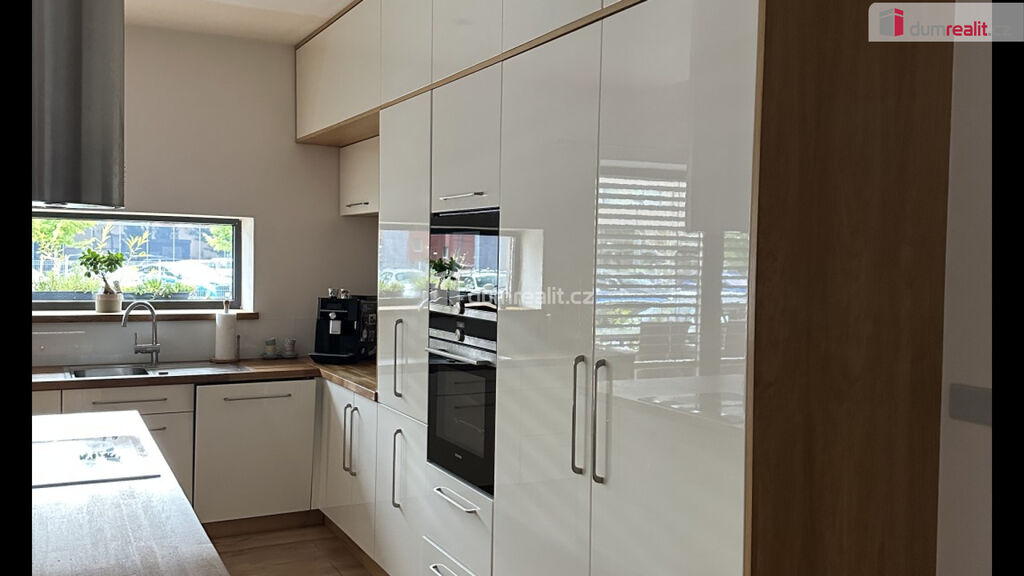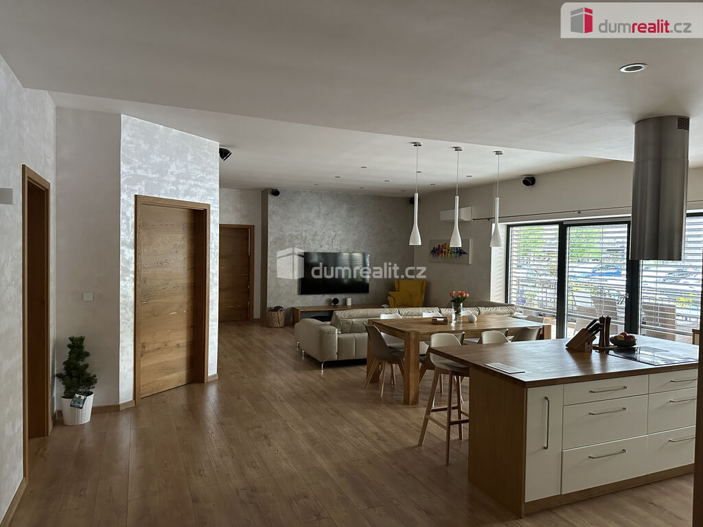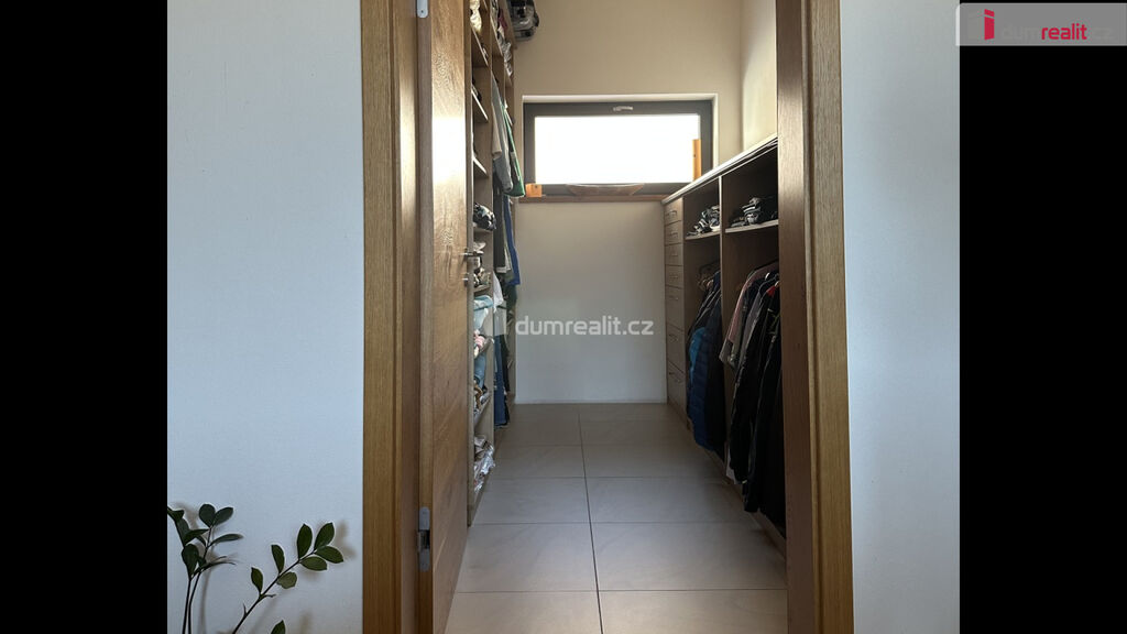 Z obývací částí domu pak dále vstupujeme do 4 samostatných místností v podobě dvou dětských pokojů, ložnice a pracovny. Samozřejmostí je prostorná koupelna s toaletou a šatna. Po dřevěných podsvícených schodech se dostáváme do patra, které tvoří vstupní část domu. Opačným směrem ve vstupním vestibulu sejdeme pouze pár schodů a tím se dostaneme do technické části. Zde je umístěn velmi moderní plynový kondenzační kotel, který obstarává teplou vodu a teplo domova. Dále do navazující sklepní části, která slouží i jako prádelna.