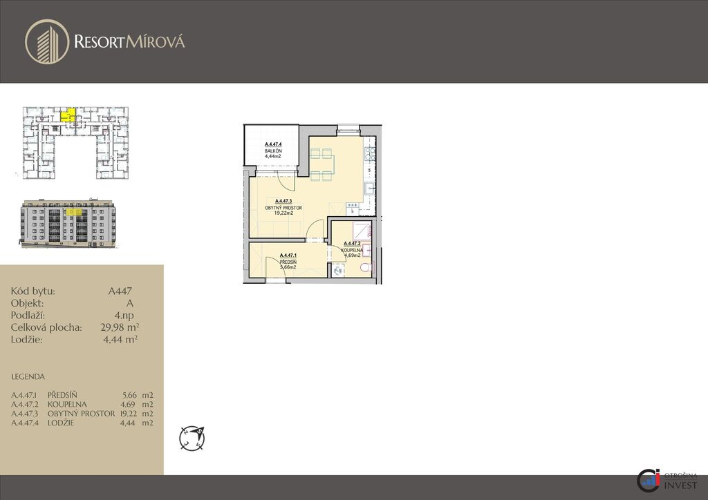 Nabízíme vám k prodeji bytovou jednotku o dispozici 1+kk o velikosti 29,98 m² + lodžie o velikosti 4,44 m² v novostavbě projektu Resort Mírová. Byt se nachází ve 4. nadzemním podlaží a je ideální volbou pro jednotlivce, páry nebo jako investiční příležitost.