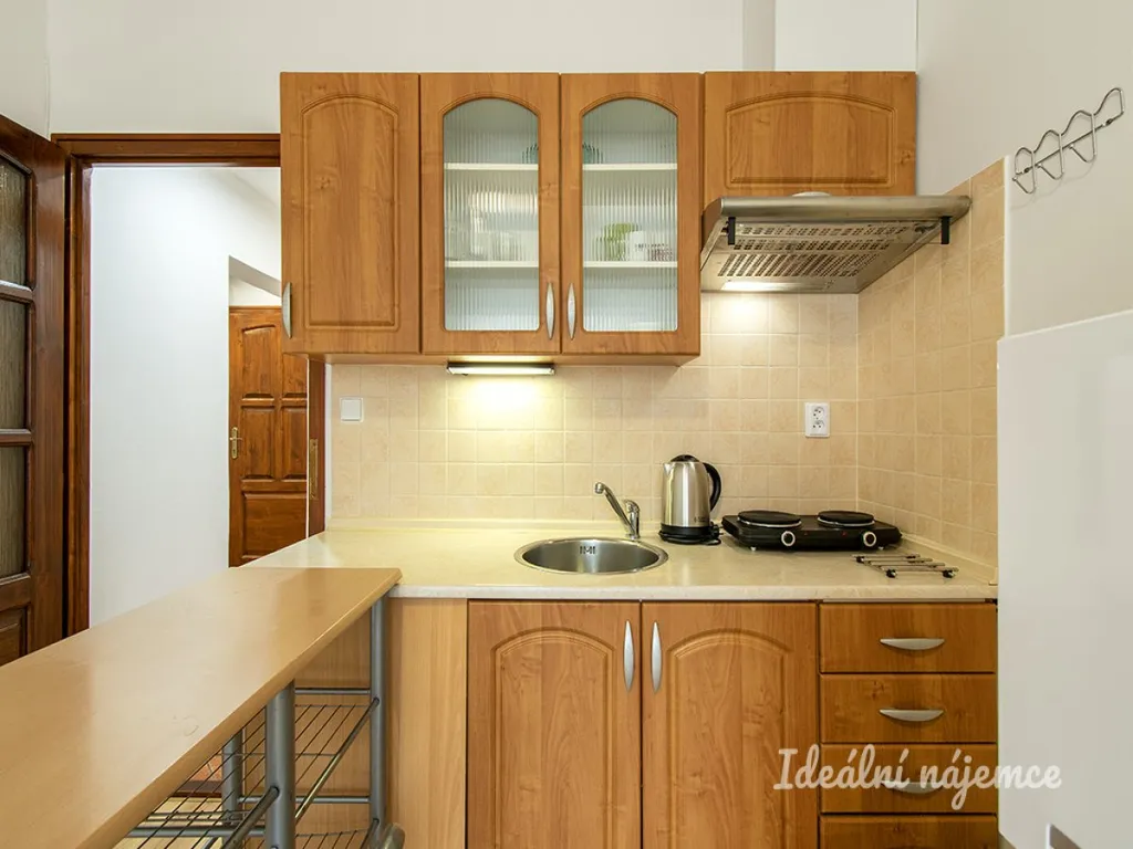 Byt se nabízí částečně vybavený. Kuchyně disponuje vařičem, digestoří, lednicí a mikrovlnnou troubou. Je zde také barový stůl s židlemi. Součástí koupelny je sprchový kout, umyvadlo, pračka a toaleta. V předsíni najdeme vestavěnou šatní skříň.