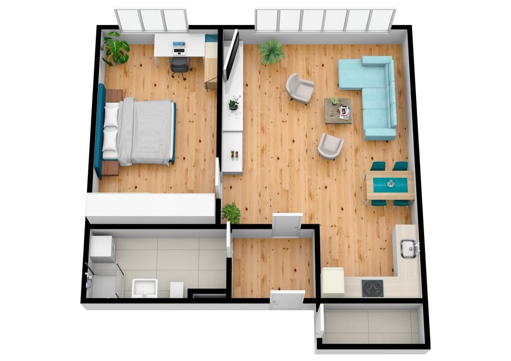 • Koupelna se sprchovým koutem, WC a přípravou na pračku i sušičku (7,5 m²)