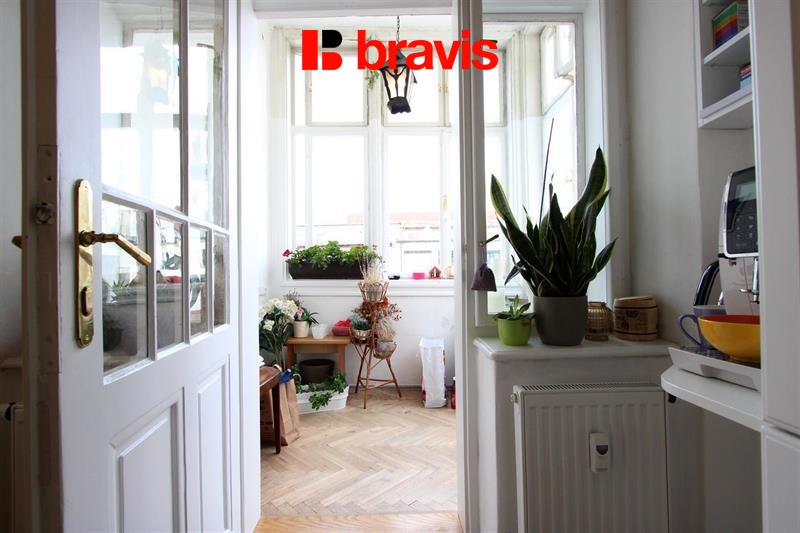 Zimní zahrada (5,5 m²) a balkon (1,5 m²) orientované do klidného vnitrobloku.