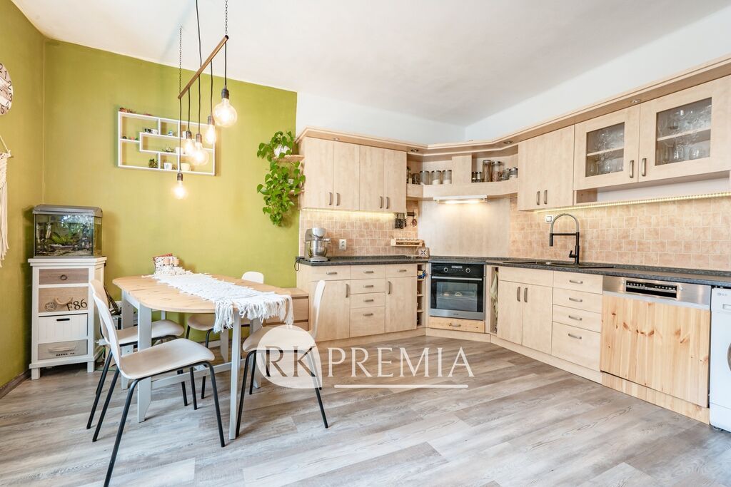 Ale pojďme k samotnému domu. Ten před pár lety prošel rekonstrukcí, která zahrnovala výměnu rozvodů topení, vody, odpadů a elektroinstalace. Nová koupelna má k dispozici vanu i sprchový kout a oddělenou toaletu. Dále je v přízemí obývací pokoj a moderní kuchyň s nadstandardně prostornou kuchyňskou linkou, kde nechybí myčka. V přízemí je také pod schodištěm umístěná šatna ze které je vchod do sklepa, kde je umístěný primární zdroj vytápění plynový kotel a bojler pro ohřev vody.