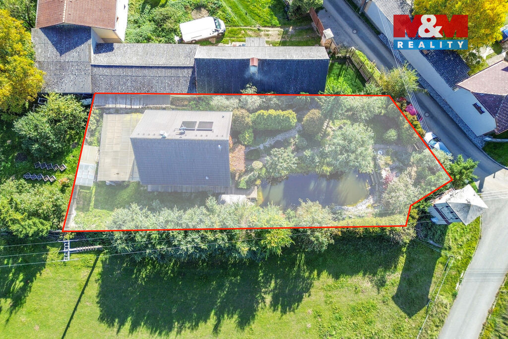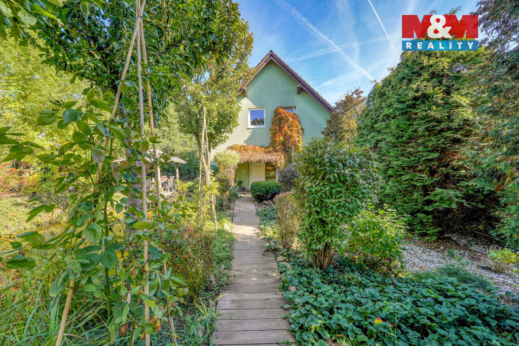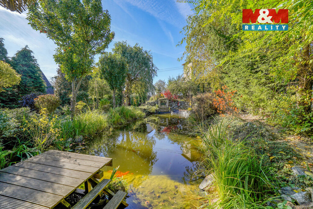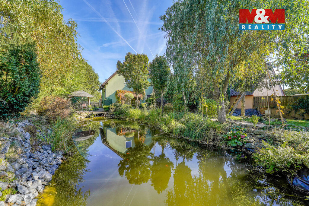 Zahrada je celá obrostlá zelení a poskytuje naprosté soukromí. Za domem se nachází terasa ideální pro letní posezení, altánek a nádherné koupací jezírko, které dodává místu klid i kouzlo. Obec Šlovice nabízí klidné bydlení s výbornou dostupností – 5 min na D5 a jen 8 min do Plzně. Veškerá občanská vybavenost je v Dobřanech, vzdálených 5 min autem.