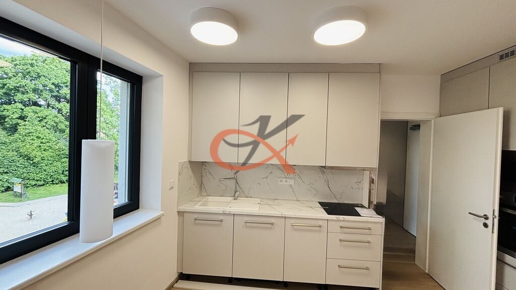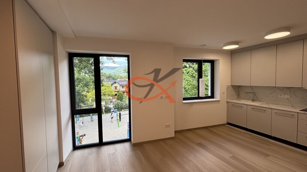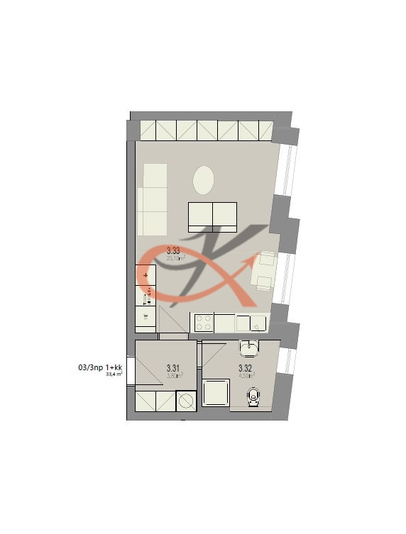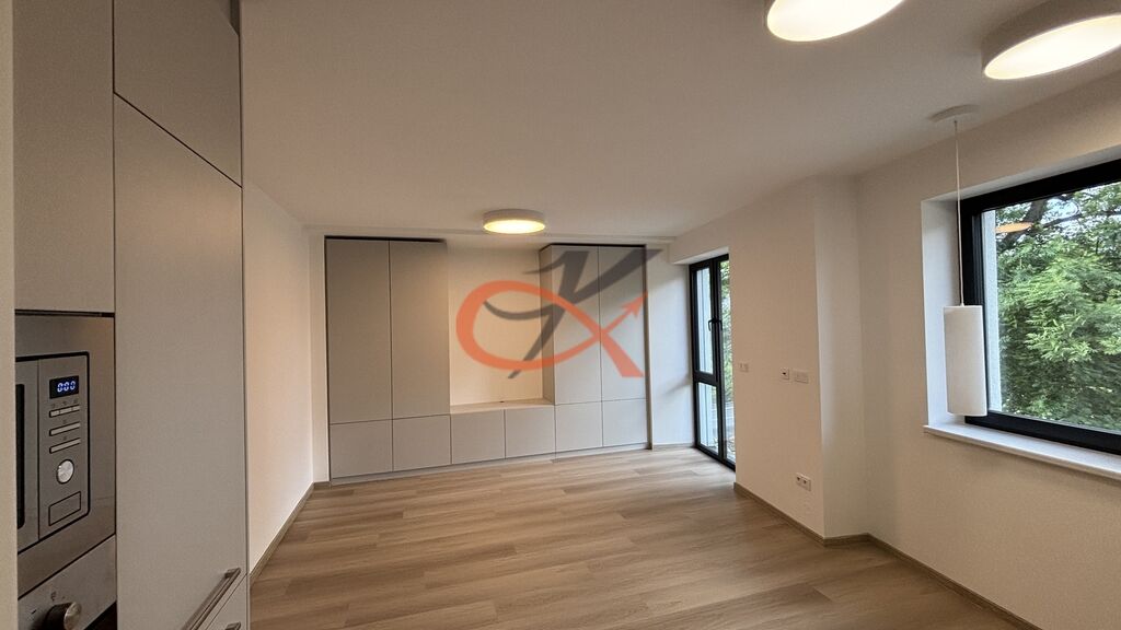 Jednotka 1+kk o podlahové ploše 33,40m² je situovaná na III. NP s východní orientací. Sestává z prostorného pokoje s kuchyňským koutem, který otevřeně dělí jídelna. V kuchyni je zabudovaná lednice s mrazákem, dále myčka, trouba, mikrovlnná trouba a indukční deska na vaření. Dále chodba s úložnými prostory, ve kterých je vybudovaná příprava na pračku a umístěn bojler. Pak už jen koupelna s WC. Vytápění podlahové, elektrické. K dispozici připojení na optiku, jedno parkovací místo před budovou. Ihned k nastěhování. Vratná kauce ve výši trojnásobku měsíčního nájemného.