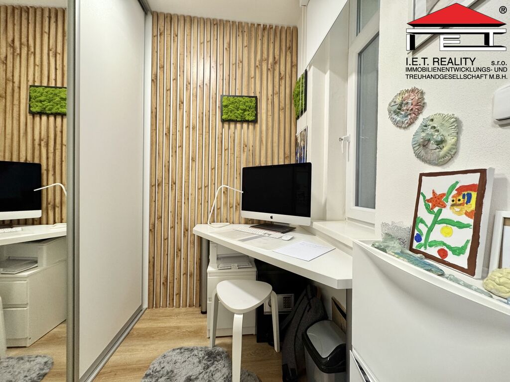 Byt prošel v roce 2021 citlivou kompletní rekonstrukcí s důrazem na maximální komfort a praktičnost. Je zařízen kvalitním interiérem na míru, který z většiny zůstává součástí prodeje. Disponuje podlahovou plochou 87 m² (užitná plocha činí 81 m²) a náleží k němu balkón (cca 1 m²) a zděná sklepní kóje (cca 4 m²) s výlučným užíváním pouze pro tuto bytovou jednotku.