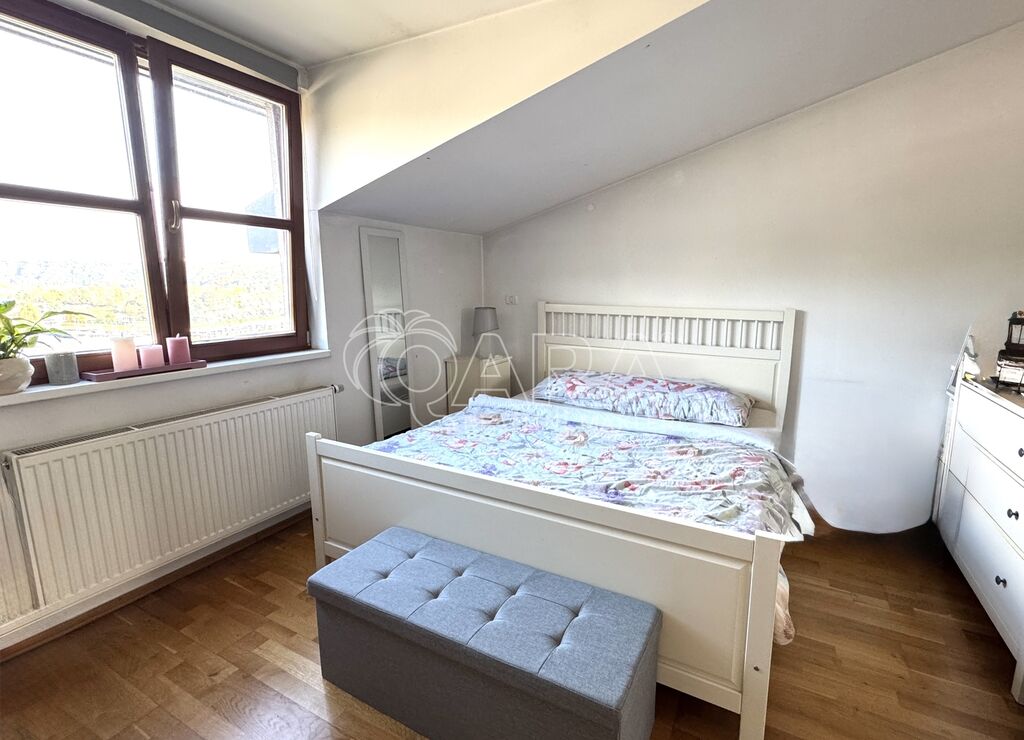 Ložnice s manželskou postelí, prostorná skříň a dvě komody. Koupelna s vanou, umyvadlem a pračkou.