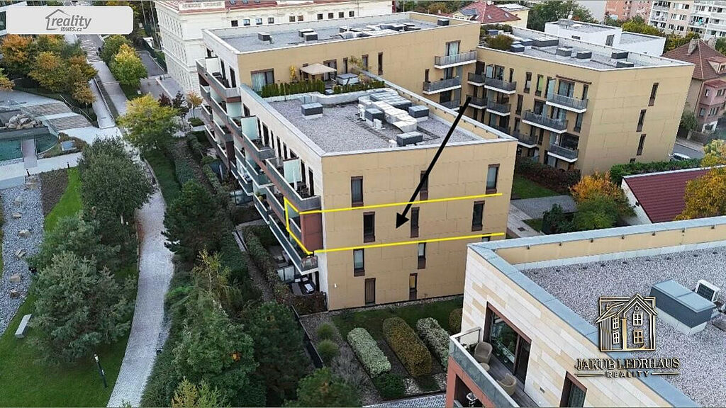 (za nemovitost, Cena je uvedena bez dvou garážových stání, každé v hodnotě 800 000 Kč. Možnost prodeje včetně stání – celková cena 18 799 000 Kč.)
