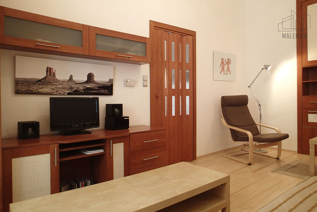V exkluzivním zastoupení Vám nabízíme částečně zařízený byt 1+1 o výměře 37,6 m². Byt se nachází ve 2. NP s okny vedoucími do klidného vnitrobloku. Ve vstupní hale je velká vestavěná skříň. V kuchyni je k dispozici kuchyňská linka se spotřebiči. Z kuchyně se vchází do koupelny, kde je masážní panel ve sprchovém koutě a na samostatnou toaletu. Z kuchyně vedou dveře do obývacího pokoje. V pokoji je k dispozici nábytek, který byl vyroben na míru. V bytě jsou položeny plovoucí podlahy, v obývacím pokoji je navíc koberec. Před kuchyňskou linkou je dlažba. Poplatky jsou velmi nízké, elektřina se převede na nájemníka (cca 3 000 Kč měsíčně - topení, ohřev vody). Maximální počet nájemníků jsou dvě osoby. Byt se nachází v těsné blízkosti tramvajové zastávky Vosmíkových. Dopravní spojení do centra je výborné. Byt bude připraven k nastěhování od listopadu.