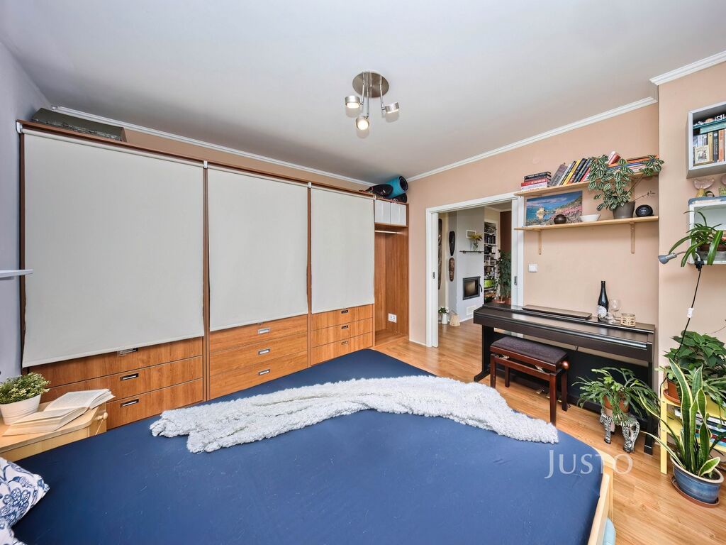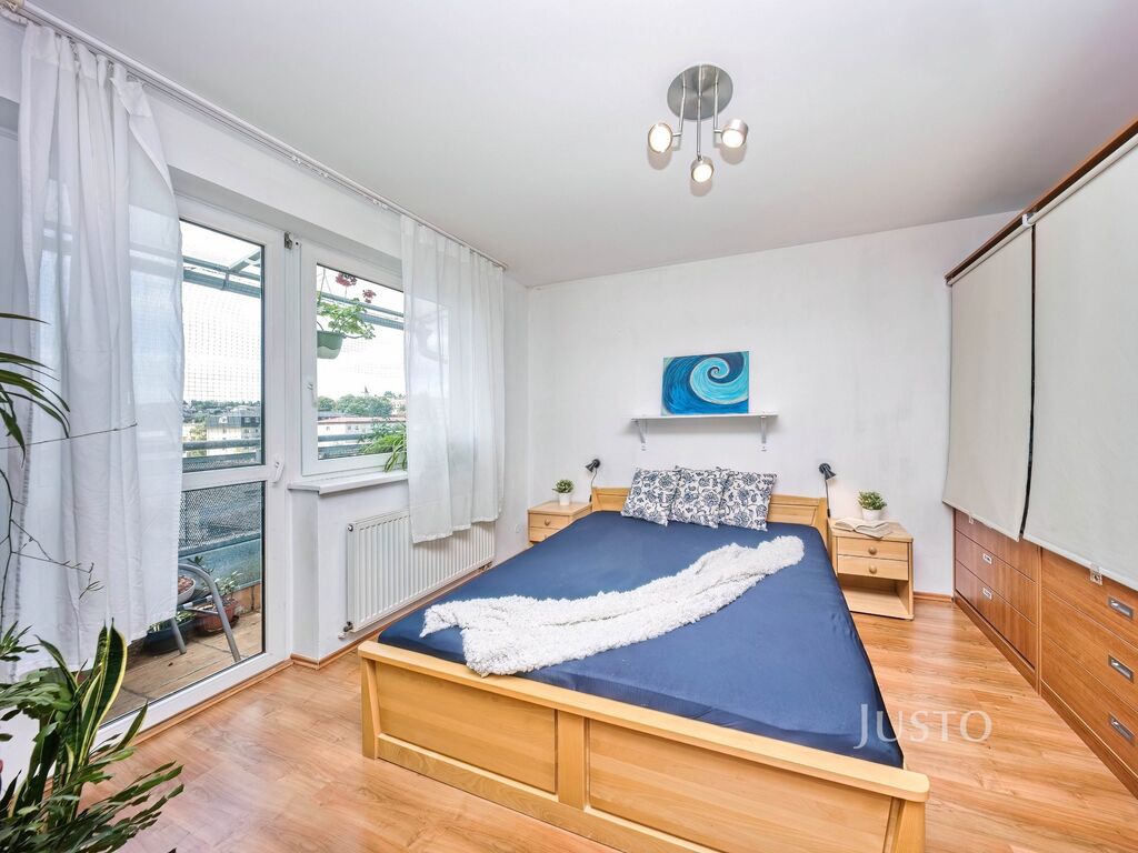 Vedle obývacího pokoje je ložnice s vestavěnými masivními skříněmi a dostatkem místa pro manželskou postel. Vstup na zastřešený balkon s nádherným výhledem na nedaleký rybník, pohodu jen umocňuje.