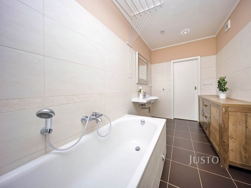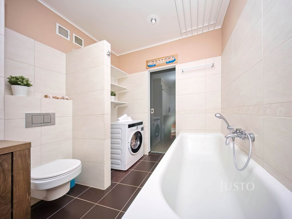 Vedle dětského pokoje je vstup do koupelny s podsvětelnou vanou a umyvadlem, které je možné rozšířit na dvojumyvadlo. V koupelně je také toaleta a pohodlné umístění pračky v systému komín, který už jen pomyslnou třešničkou na dortu služeb, který byt nabízí.
