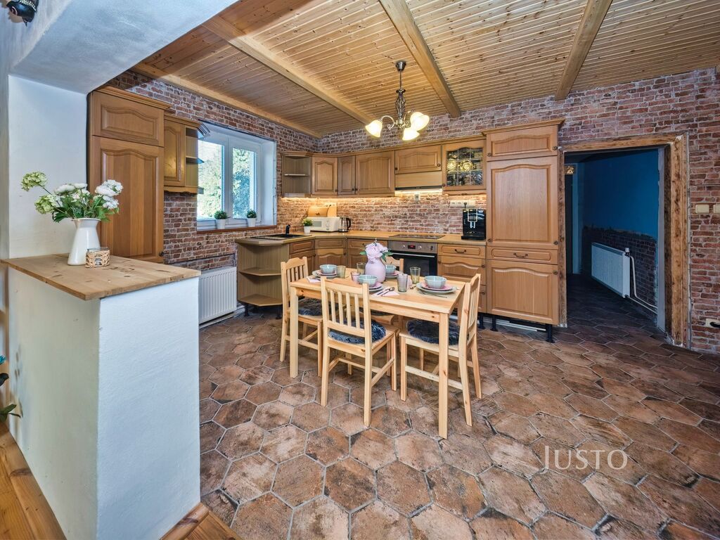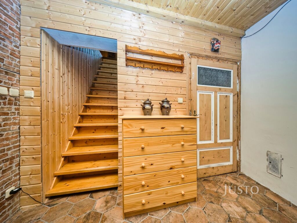 V zastoupení majitele nabízíme k prodeji rodinný dům ve stylu roubenky o dispozici 4+kk. V domě je ve velké míře použito dřevo, aby dům působil útulným dojmem. V přízemí domu se nachází předsíň, na kterou navazuje kuchyně propojená s obývacím pokojem. V obývacím pokoji jsou velká kachlová kamna, která navozují příjemnou a pohodovou atmosféru domu( majitelé si kamna sice odvezou, ale nový majitel si může vyřešit vytápění podle svých přestav.) Podlaha je z ošetřených borovicových prken a strop je obložen dřevem. Obývací pokoj přímo navazuje na kuchyni a tvoří jeden velký otevřený prostor, kdy může být celá rodina neustále v kontaktu.