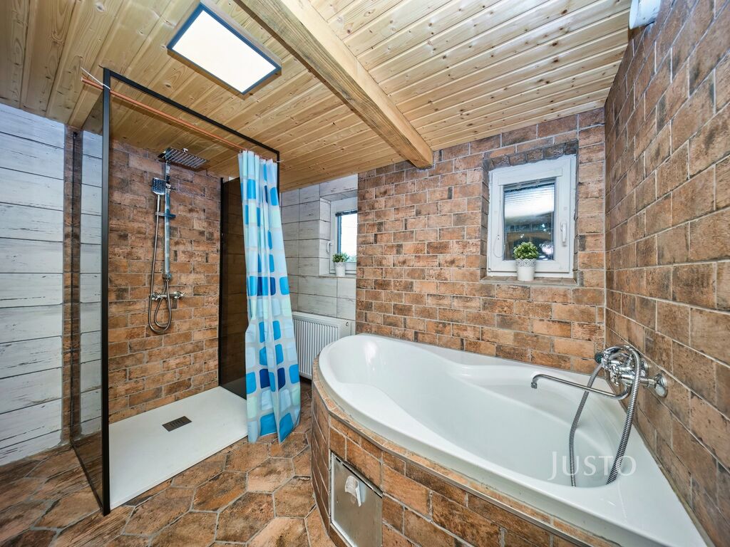 V přízemí domu je také koupelna, kde je vana i sprchový kout a umyvadlo. Toaleta je v přízemí řešena samostatně. Za koupelnou jsou i úložné prostory pro skladování potravin.