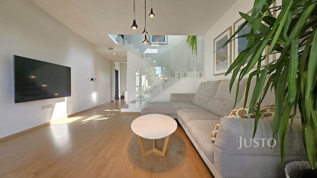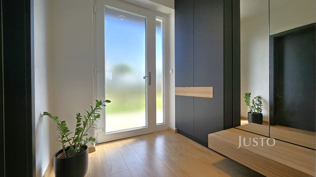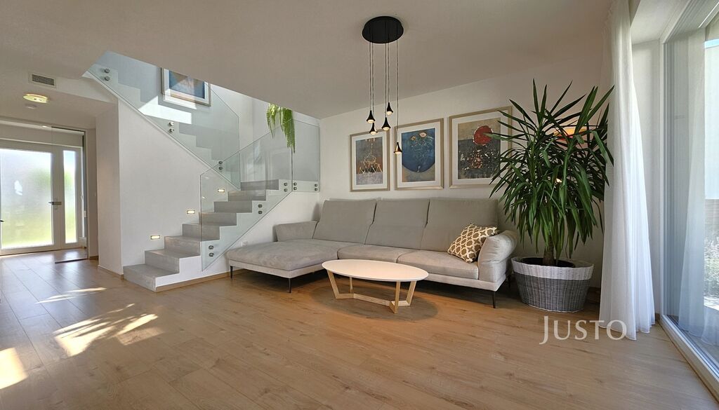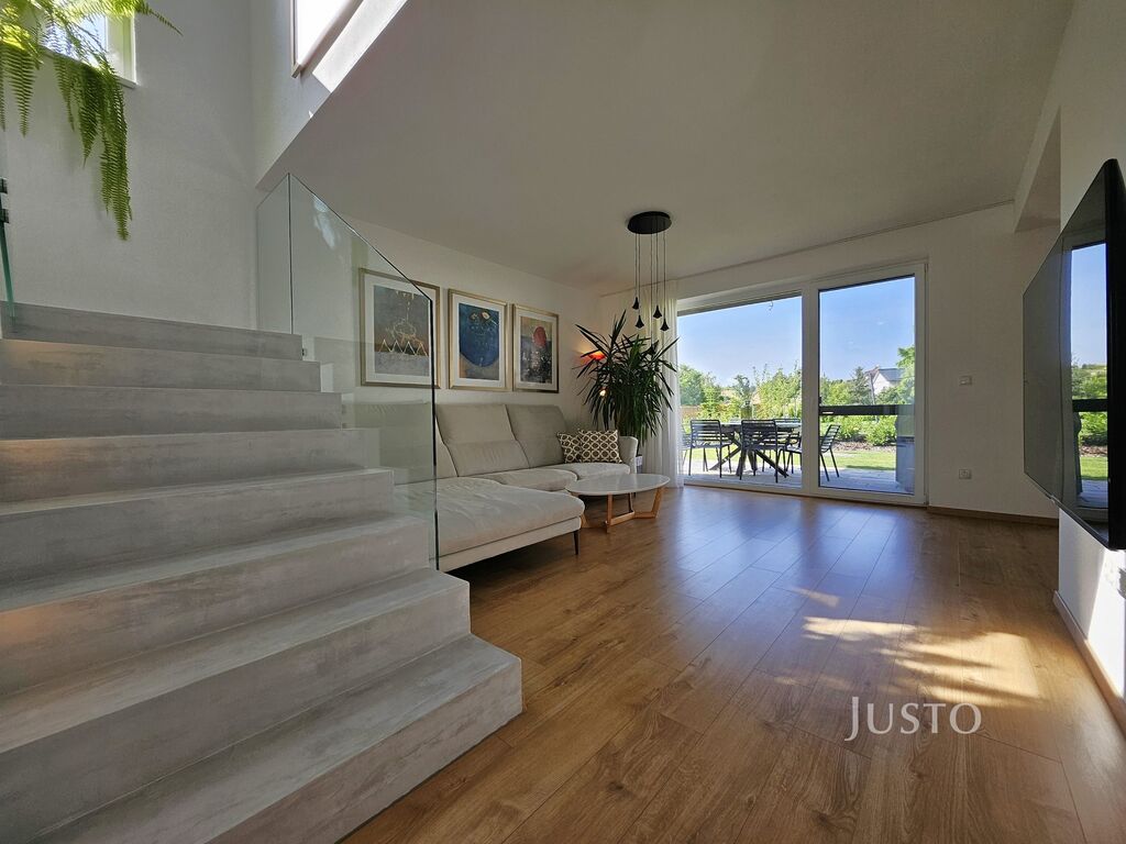 Dispoziční řešení domu je 4+kk s garáží, terasou a zahradou. Kombinace použitých materiálů v interiéru, jako je sklo a světlé dřevo vytváří velmi příjemnou atmosféru. Dům je pěkně světlý.