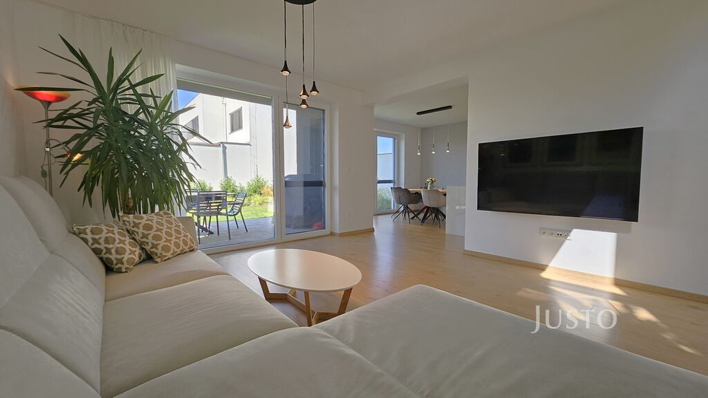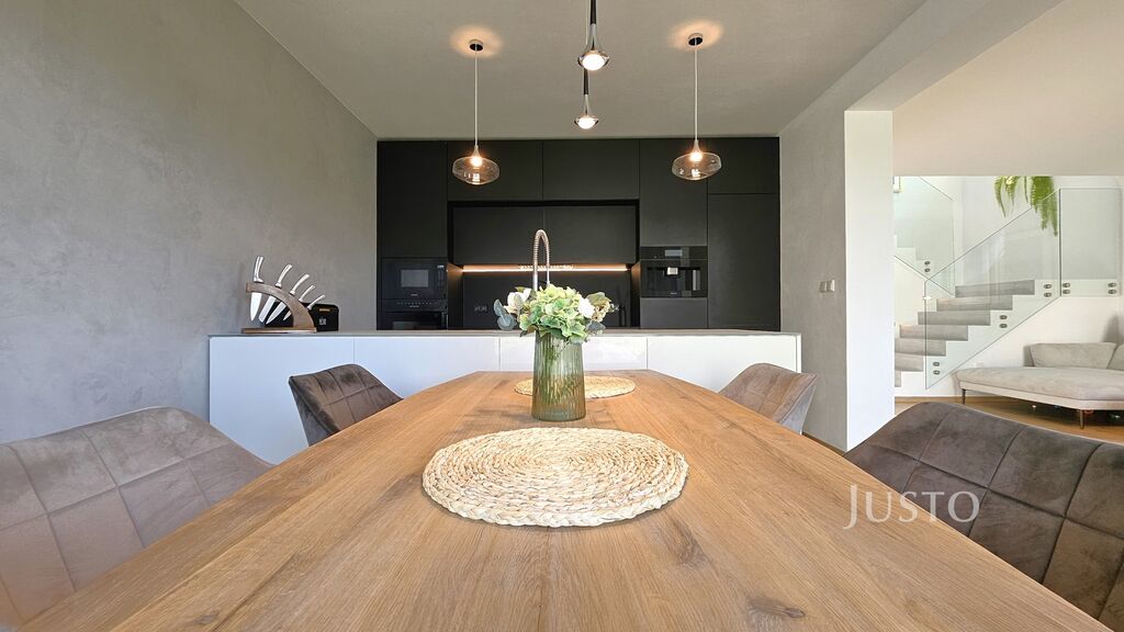 Kuchyňská linka je plně vybavena zabudovanými spotřebiči zn. Miele vyšší třídy, pracovní deska je ze speciálního, tvrzeného italského skla. Stejný materiál je použit v horní koupelně. Z obývacího pokoje i z kuchyně je vstup na terasu a dále na zahradu.