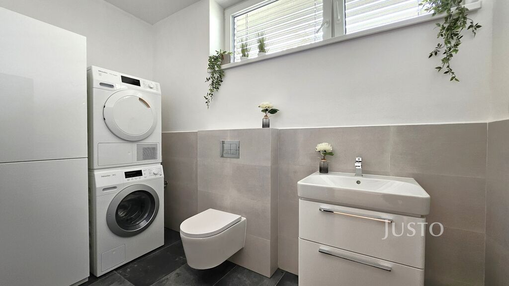 Pod schodištěm do patra je praktická spíž. V přízemí je koupelna s toaletou a sprchovým koutem a místem pro pračku a sušičku.