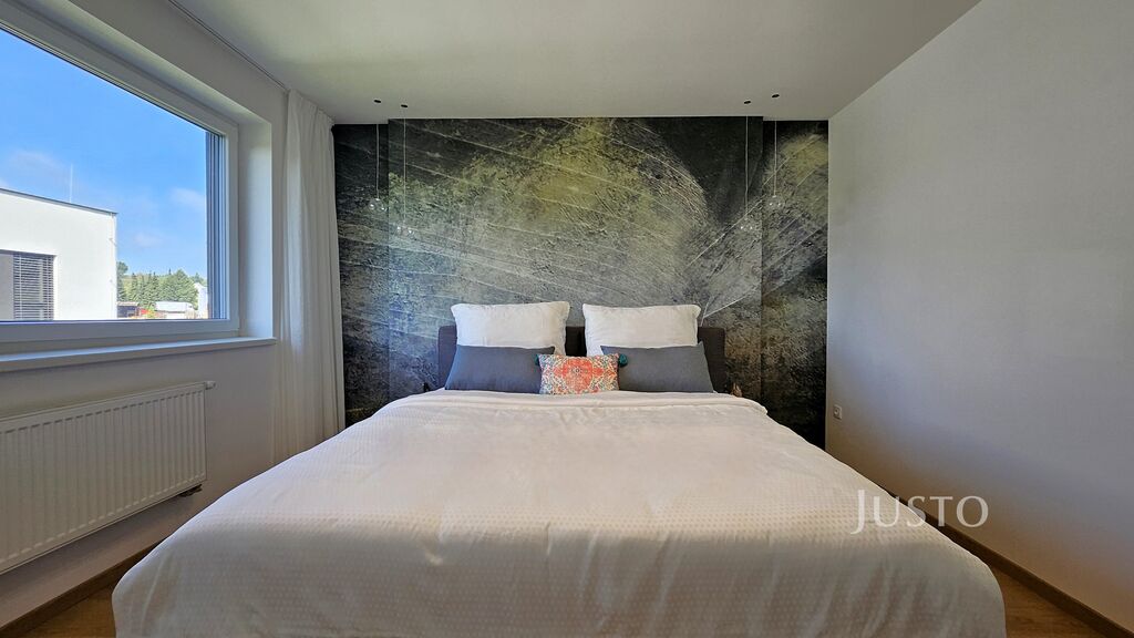 V patře jsou tři ložnice, každá se svým vstupem. Dále je zde velkorysá koupelna s vanou, toaletou a bidetem, použity jsou zařizovací předmět zn. Villeroy Bosh. Jistě oceníte praktickou šatnu.