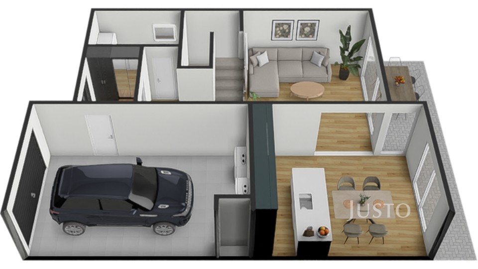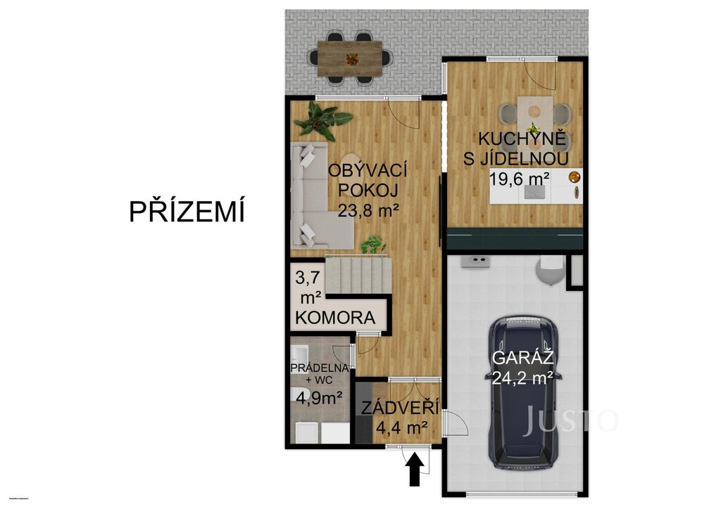 V přízemí domu je zádveří, ze kterého je vstup do garáže a dále pak do přízemních prostor, které jsou tvořeny obývacím pokojem volně spojeným s obytnou kuchyní.