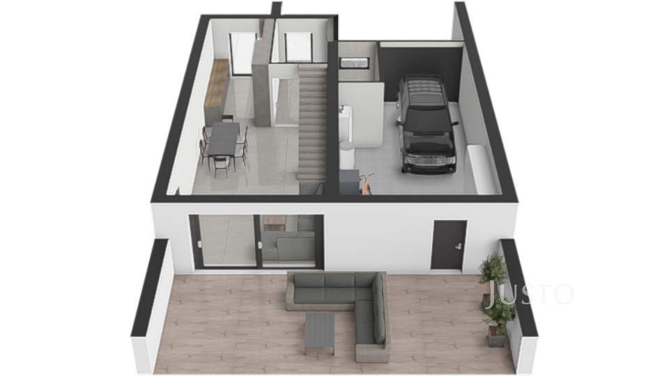 V přízemí najdete velkorysý obývací pokoj s kuchyňským koutem o výměře 42,3 m², odkud je přímý vstup na prostornou terasu a zahradu (254 m²). Součástí přízemí je také samostatná toaleta a vstup do dvojgaráže o výměře 36,1 m², ve které se nachází technické zázemí domu.