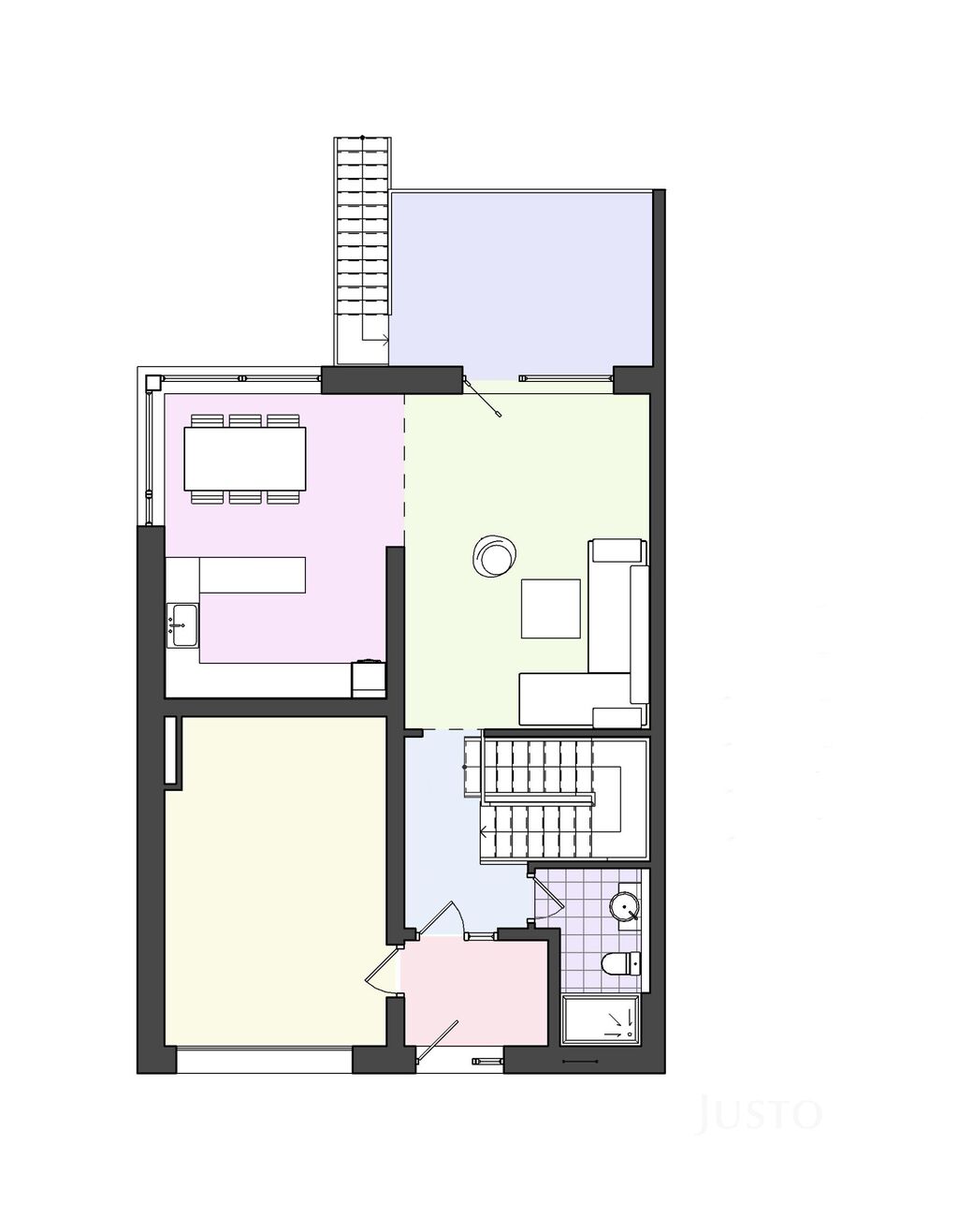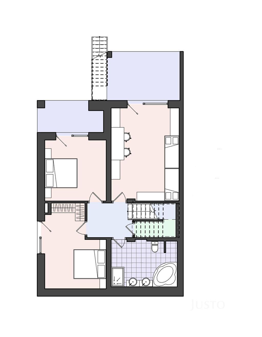Dispozice 4+kk je řešena velmi prakticky s důrazem na soukromí a pohodlí: