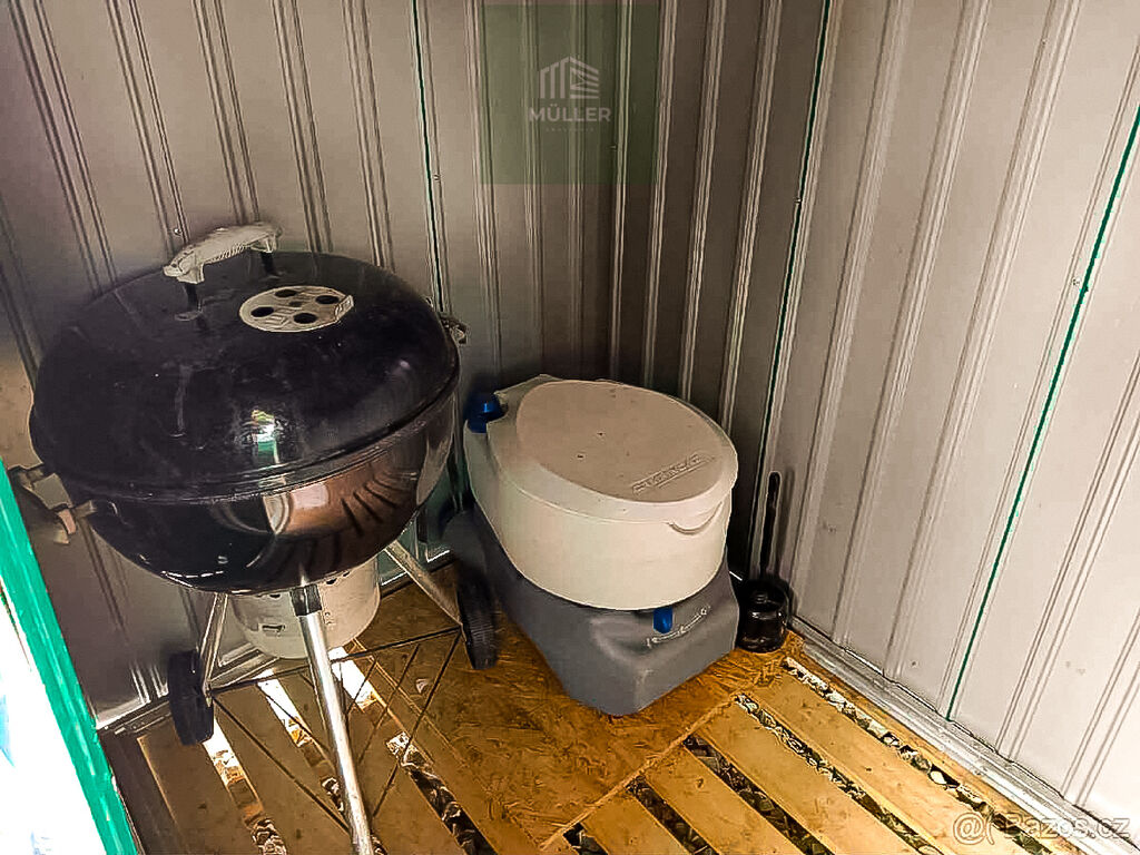 Povrch tvoří štěrková plocha, celý pozemek je nově oplocený a nachází se na něm menší box využívaný jako úložný prostor – v současnosti slouží pro suchý záchod a uskladnění grilu.