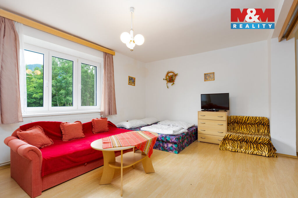 Nabízíme vám ke koupi dům se zahradou, který je již prohlášením vlastníka rozdělený na 4 bytové jednotky o dispozici 1+1. Na každém patře jsou dva byty a ke každému z nich náleží ještě komora v domě a úložný prostor v dřevěné kůlně, která navazuje na dům. Za domem je objekt bez čísla popisného, kde je v přízemí sklad a v patře kuchyň s pokojem a dle prohlášení vlastníka náleží k jednomu z bytů. Je zde zavedena elektřina a veřejný vodovod. Vytápění je plynem ze zásobníku, ohřev vody bojlerem, odpad sveden do septiku. Dům je momentálně prázdný, je možné ho financovat úvěrem, který vám zdarma vyřídíme. Vhodné jako investice za účelem pronájmu nebo i k trvalému bydlení. V obci je bohatá občanská vybavenost, okresní město Šumperk je pouhých 14 km. Pro více informací kontaktujte prosím makléře.