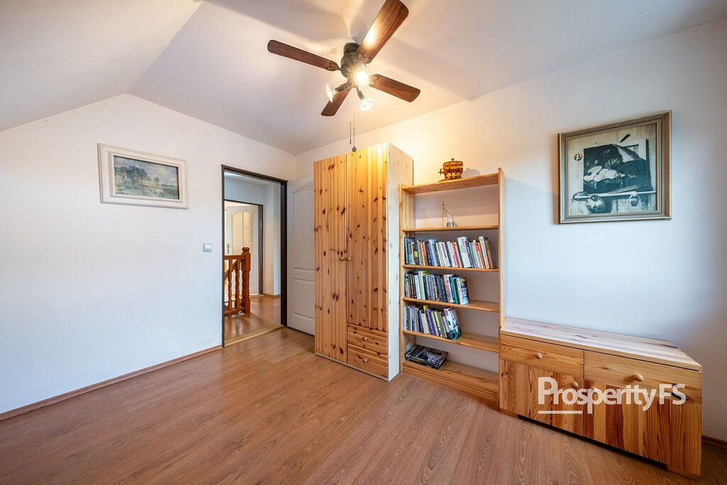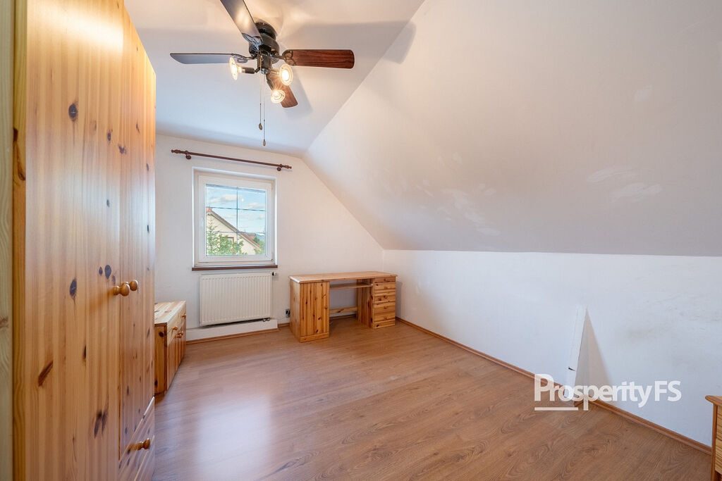 V patře jsou tři ložnice, koupelna s vanou a praktická komora. Nad obytnou částí je půda, kterou lze využít jako úložný prostor.