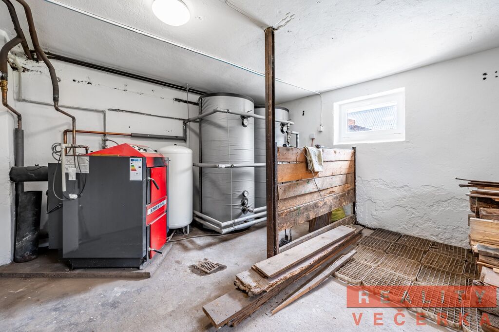 Dům je podsklepený, nachází se zde kotel na dřevo s příslušenstvím, bojler na teplou vodu, prádelna a skladové prostory.