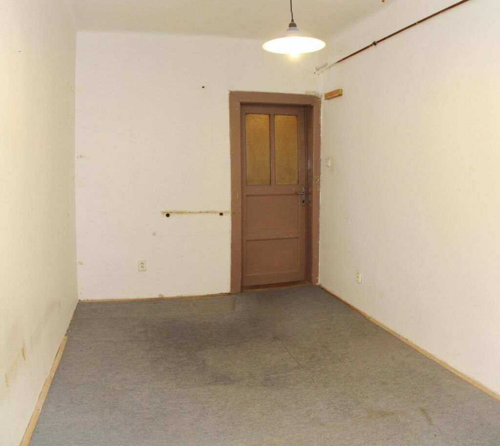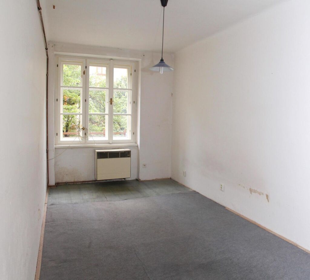 Byt je neadaptovaný a vyžaduje celkovou rekonstrukci. Praktická dispozice bytu zahrnuje předsíň se vstupem do všech ostatních místností bytu, pokoj s kuchyňským koutem, ložnici, koupelnu společnou s WC a malou komoru. Standardem bytu jsou repasovaná špaletová okna s orientací do klidné ulice, retro kuchyňská linka s plynovým vařičem, původní dřevěné dveře do dřevěných zárubní, podlahy - staré PVC a koberce na prkenném podkladu a keramická dlažba v koupelně, vana, umyvadlo, kombi WC. Ohřev vody pro byt zajišťuje elektrický bojler, vytápění pak plynová tělesa WAW.