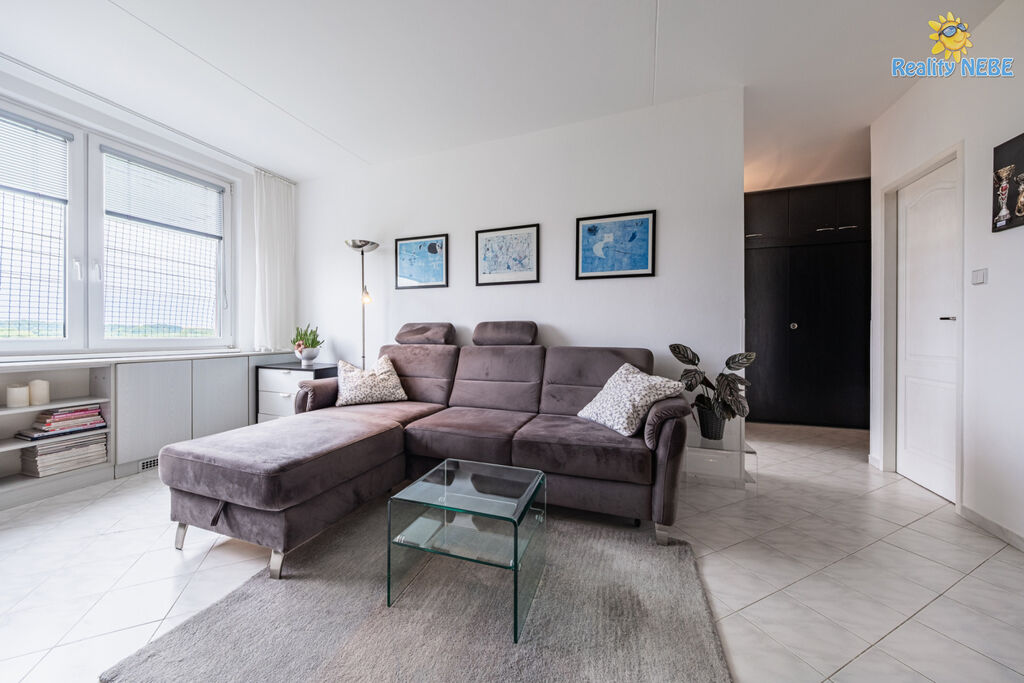 Skládá se ze samostatné ložnice, obývacího pokoje se kuchyňským koutem (linka s vestavnými spotřebiči - lednice s mrazákem, el. varná deska, trouba, digestoř, mikrovlnná trouba, možnost pračky a barovým pultem). Koupelna se sprchovým koutem a WC. Ve vstupní chodbě se nacházejí vestavné šatní skříně, byt má bezpečnostní dveře a náleží k němu sklepní kóje v suterénu domu.