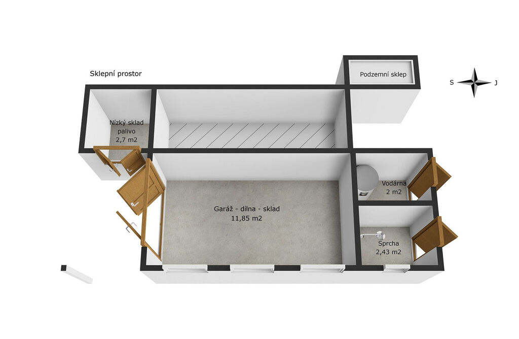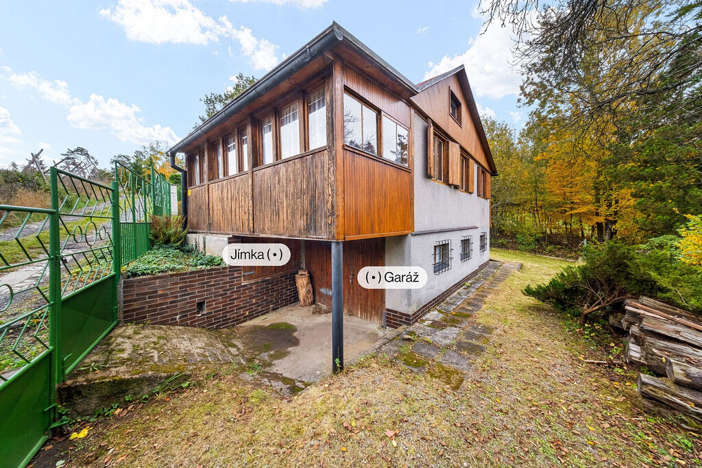 V suterénu je sprchový kout s elektrickým bojlerem, sklad, vodárna a dílna (bývalá garáž), což zajišťuje praktické zázemí pro každodenní i rekreační využití.