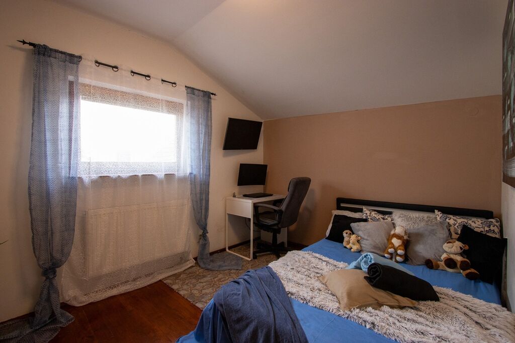 V poschodí, kam vede masivní dřevěné schodiště s mechovým stromovým obrazem, naleznete dva další pokoje a prostornou koupelnu s vanou a WC s podlahovým vytápěním. Kachličky s motivem rezavého kamene přidávají prostoru jedinečný charakter.