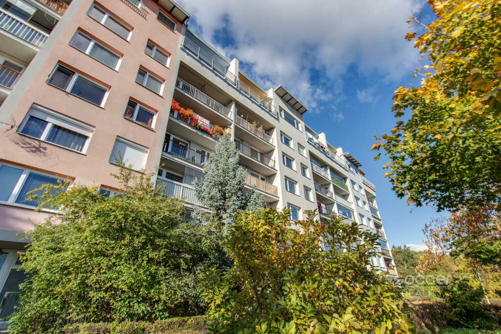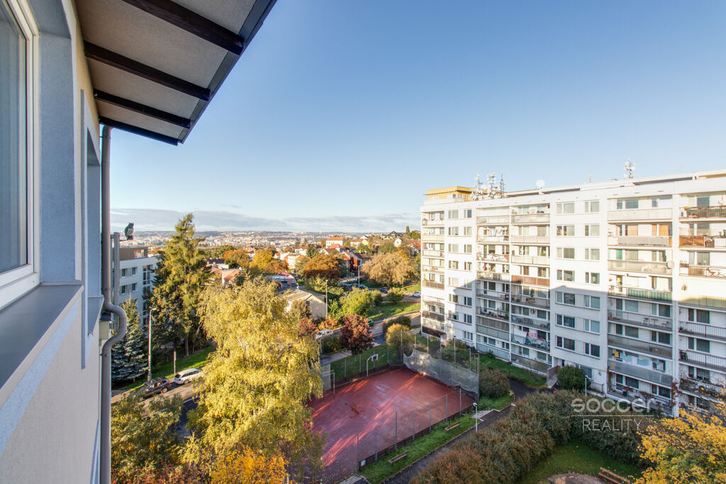 Jádrem bytu je prostorný obývací pokoj se vstupem na velkou terasu (10 m2), odkud se rozprostírá nádherný panoramatický pohled na celou Prahu s optimální jihovýchodní orientací. Z ložnice je navíc přístupný menší balkon ( 5 m2). Pro vaše maximální pohodlí je v bytě instalována klimatizace.