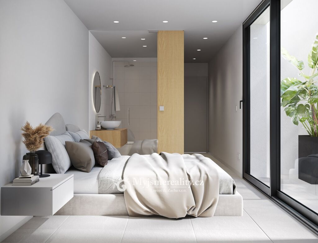 Hlavní ložnice, jež se nachází v přízemí tohoto impozantního domu je vybavena samostatnou šatnou a luxusní koupelnou a vstupem do atria (jedná se o prostor uvnitř domu se zelení, který umocňuje soulad s přírodou a zajišťuje tak maximalizaci prosvětlení celého domu). Prostorný obytný prostor s detailně promyšlenou kuchyňskou linkou je zalit přirozeným světlem díky velkoformátovým hliníkovým oknům systému (HS profil), které plynule navazují na zahradu s terasou.