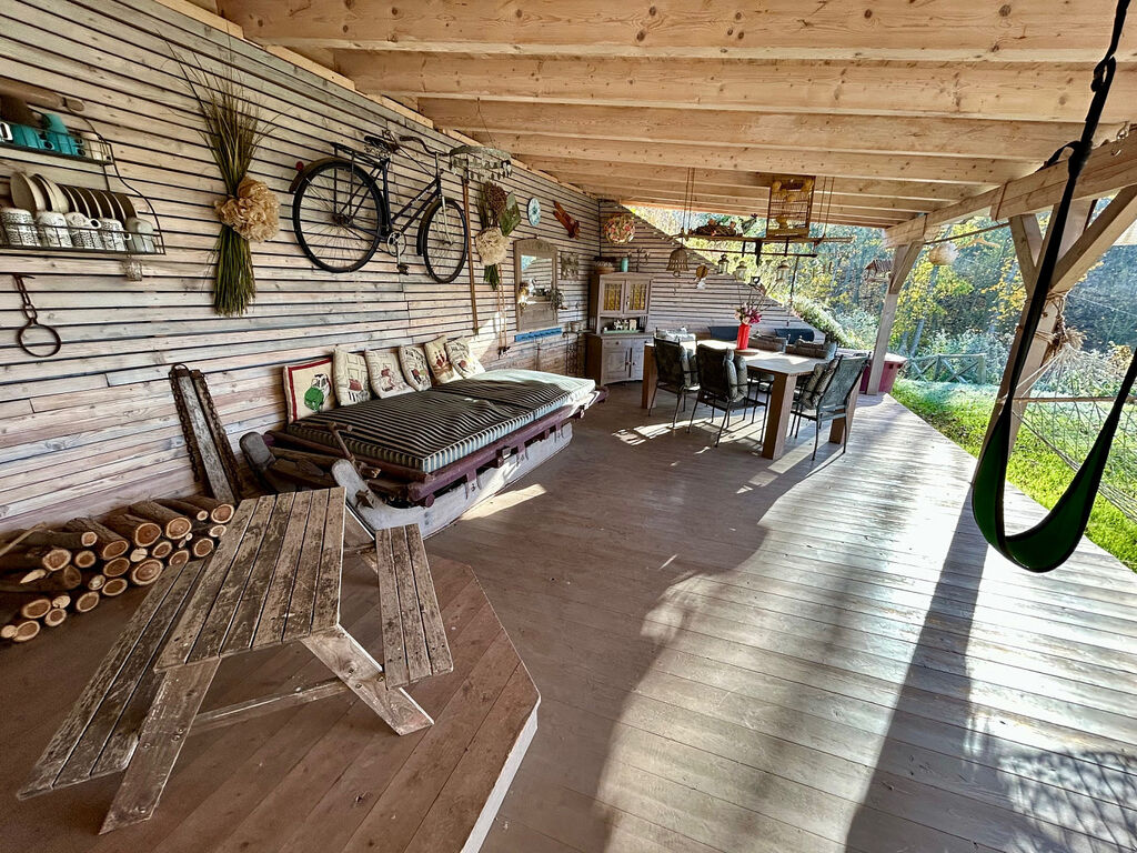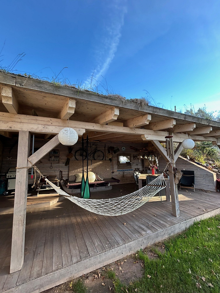 Podlahovou plochu domu (115m²) podstatným způsobem dále rozšiřuje celoročně využitelná velká zastřešená (zelená střecha) terasa nabízející zázemí pro grilování, hry, posezení s přáteli a další aktivity. Pro uložení dřeva, nářadí apod. je k dispozici prostorná suchá kolna.