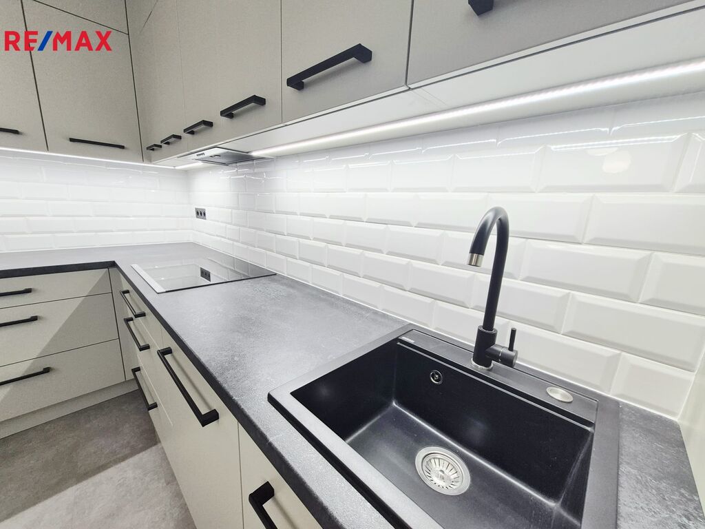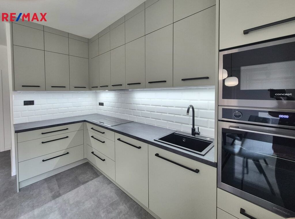 Kuchyň (cca 16 m²) je vybavena zcela novou kuchyňskou linkou se všemi moderními spotřebiči – indukční varnou deskou, horkovzdušnou troubou, mikrovlnnou troubou, myčkou, digestoří a dřezem. Součástí je také jídelní stůl a úložná skříň, vše v elegantním a sladěném designu.