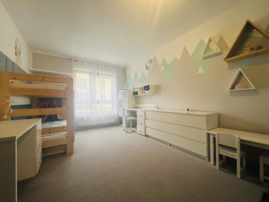 Třetí pokoj je nyní využíván jako dětský pokoj s dvoupatrovou postelí, komodami, vestavěnou skříní a psacím stolem s židlí.