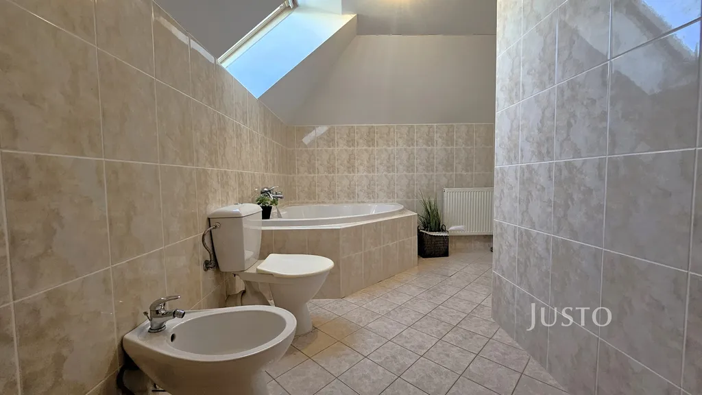 V podkroví Vás potěší šatna o výměře 2,8 m². Dále jsou zde dvě prostorné ložnice 14,8 m² a 17,6 m². Koupelna je s toaletou, bidetem, rohovou vanou, přímo odvětrána oknem. Ložnice v podkroví jsou plnohodnotné a bez výrazně snížených šikmých stropů, takže působí vzdušně, prostorně a nabízejí plnohodnotné využití každého metru čtverečního.