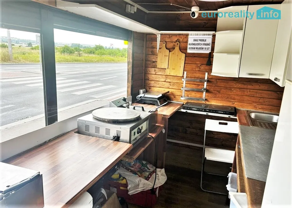 Stánek je zánovní a je připraven k okamžitému provozu. Vybavení: lednice, mrazák, pracovní pulty a police, fritéza, grilovací zařízení, dřez s rozvody vody, elektrické rozvody, osvětlení, venkovní výdejní okno s roletami, reklamní cedule s jídelním lístkem (možno ponechat nebo odstranit).