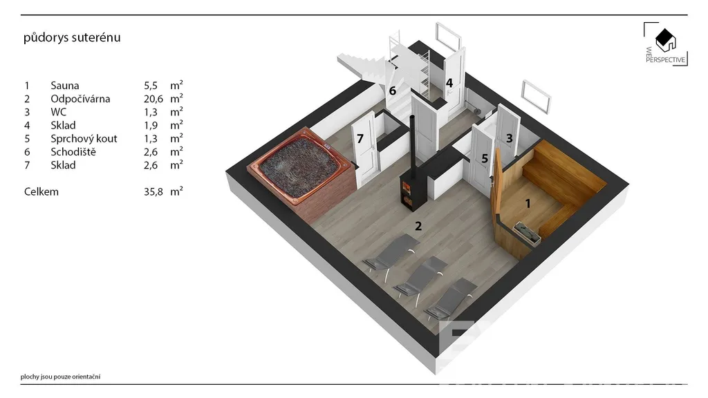 Dominantou suterénu je finská sauna s odpočívárnou, toaletou a sprchovým koutem. Dále se zde nachází velký chladící box, pánem domu a nadšencem do myslivosti, využívaný na zvěřinu, komora a technická místnost.