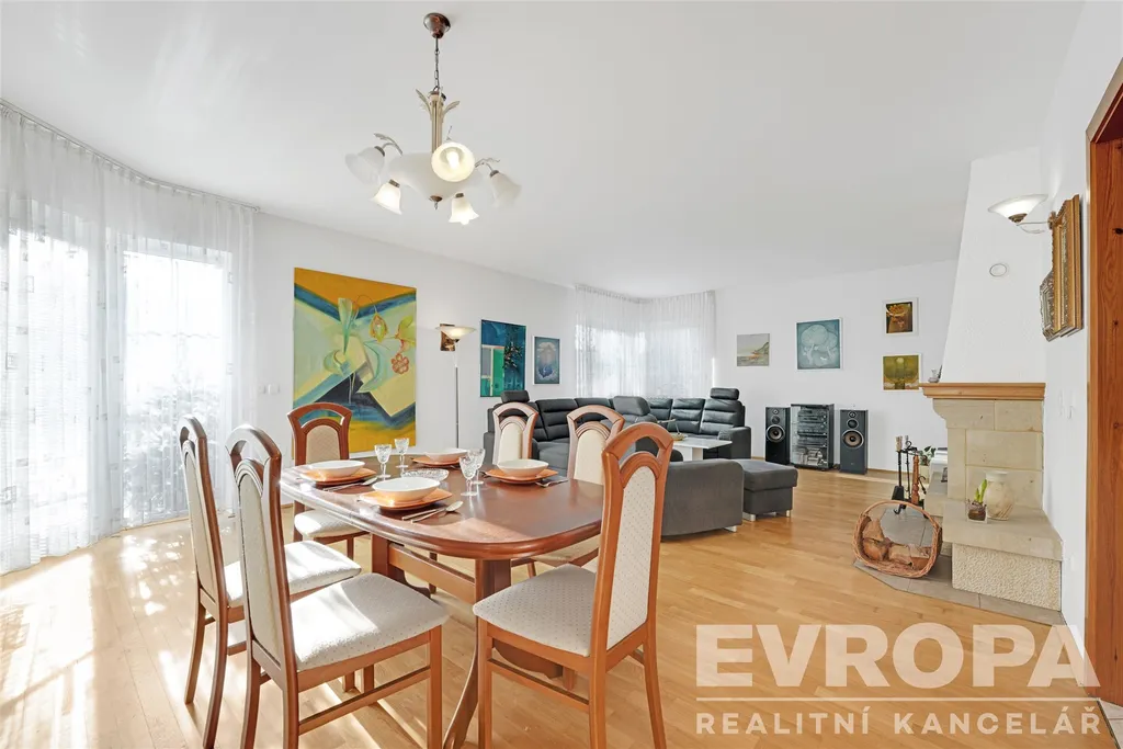 Cihlový rodinný dům se prodává kompletně vybavený a jeho celková podlahová plocha je 350 m2 s dispozicí 6+1 se třemi koupelnami, toaletami a domácím wellness.