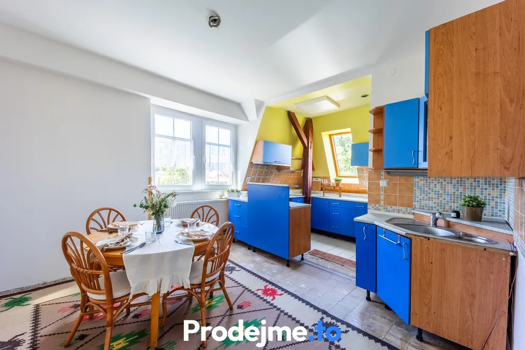 Po zachovalém dobovém schodišti se dostanete do druhé bytové jednotky 3+kk (81 m²) s kuchyní a jídelnou, prostornou ložnicí, dalším pokojem a velkou koupelnou s vanou i sprchovým koutem.