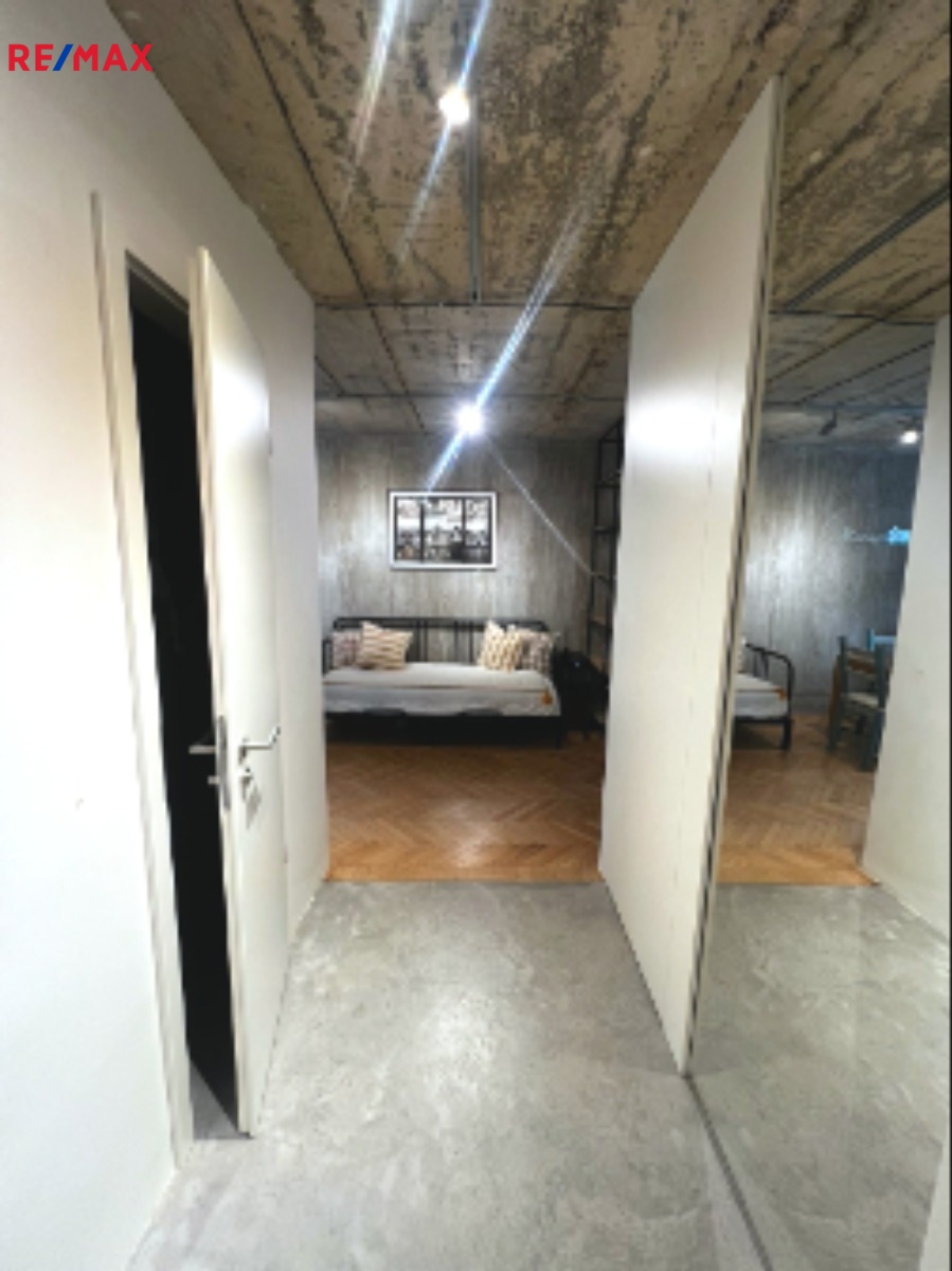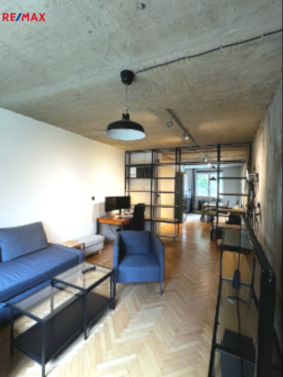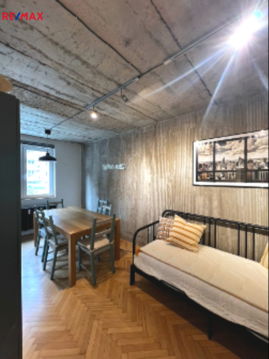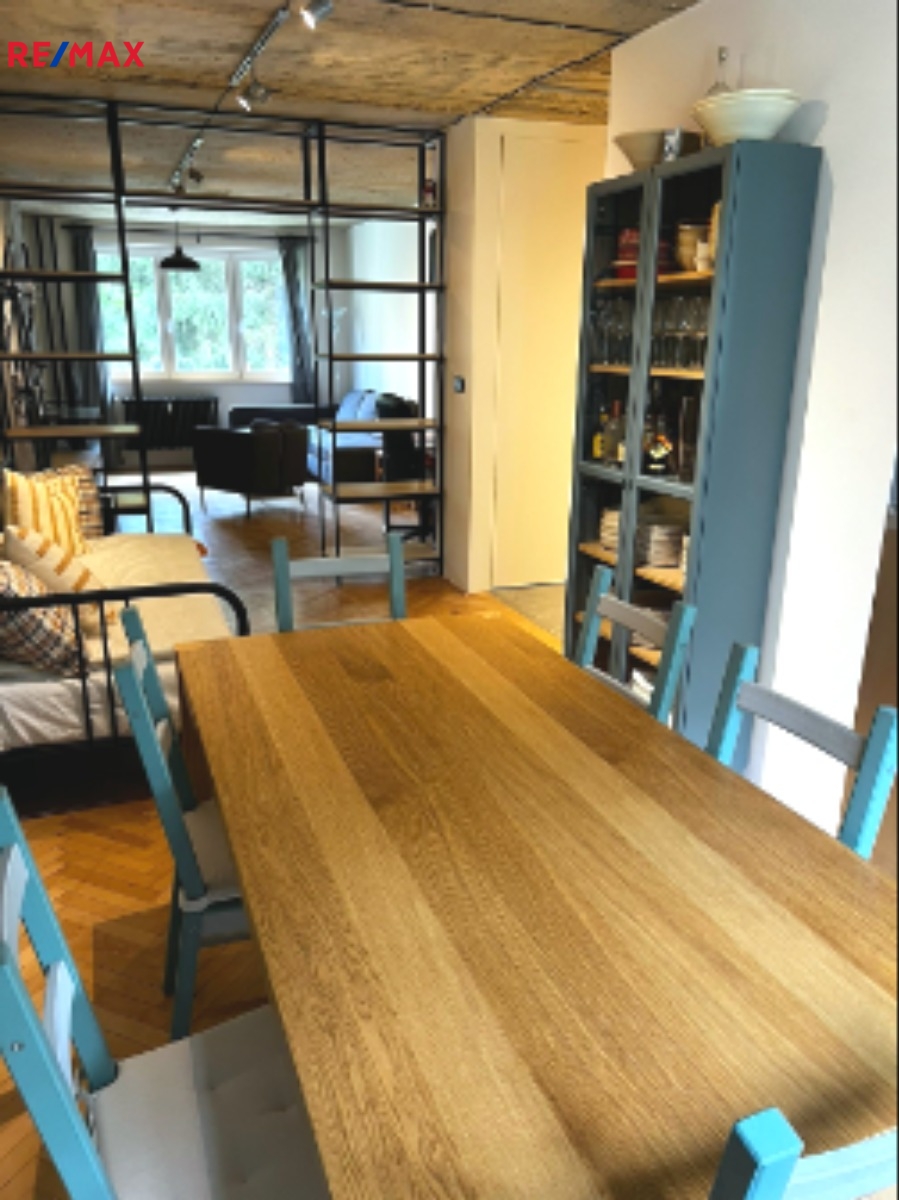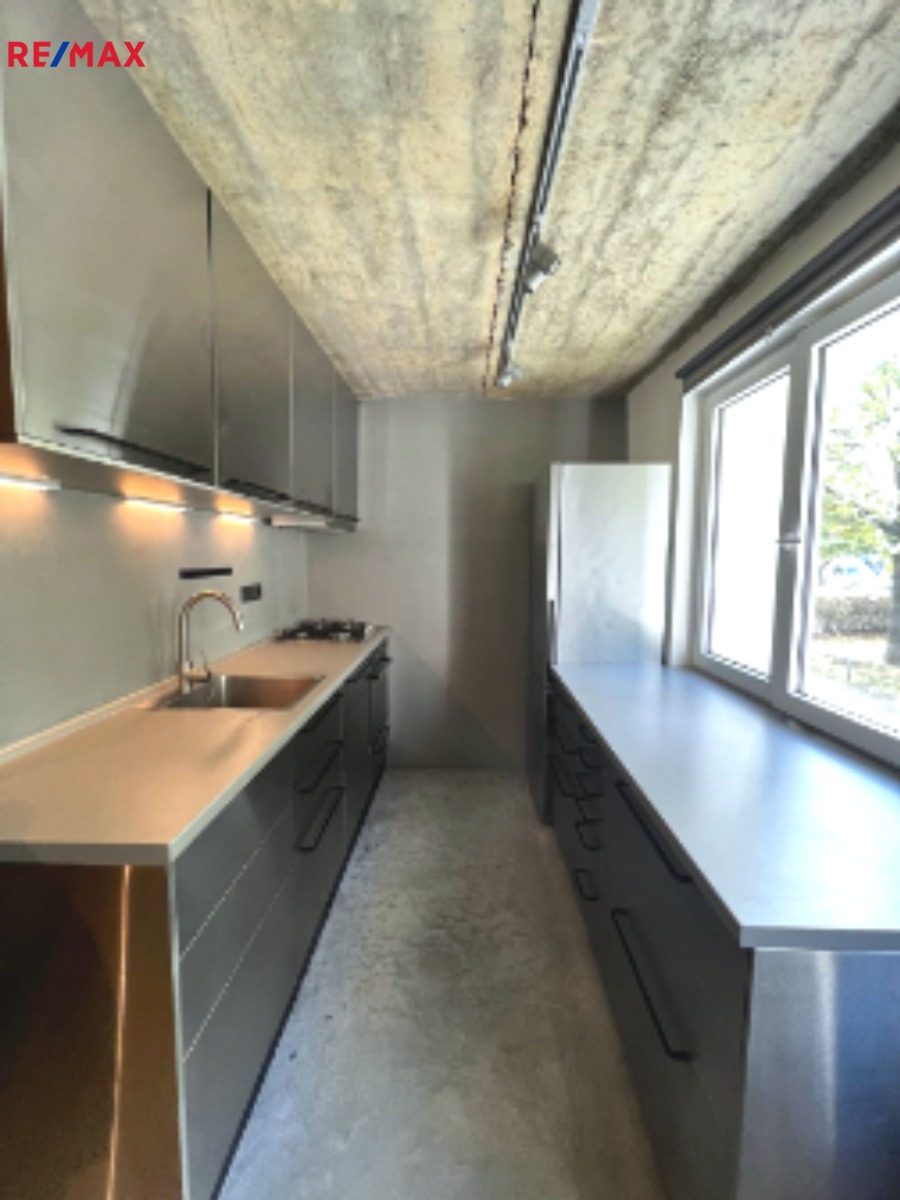 Nabízíme k pronájmu jedinečný byt 2+kk (původně 4+1), o podlahové ploše cca 73 m2 + lodžie 4 m2 , v 1. nadzemním podlaží bytového domu v pražských Záběhlicích, který prošel promyšlenou rekonstrukcí a nabízí originální atmosféru industriálního stylu. Úpravou dispozice vznikl vzdušný, otevřený prostor s podlahovou plochou cca 41 m², propojující kuchyň, jídelnu a obývací část. Jednotlivé části jsou pouze opticky rozděleny a navazují na předsíň. Kuchyňská linka je plně vybavena: plynová varná deska, elektrická trouba, myčka, lednice s mrazákem a pračka se sušičkou. Z otevřené předsíně je vstup do koupelny se sprchovým koutem a samostatné toalety. Ložnice o velikosti cca 23 m² nabízí 7 vestavných skříní a přímý vstup na zasklenou lodžii. Další úložné prostory zajišťuje vestavná skříň v předsíni. Orientace bytu na západ (kuchyň, jídelna) a východ (obývací část, ložnice, lodžie) zajišťuje dostatek denního světla po celý den.