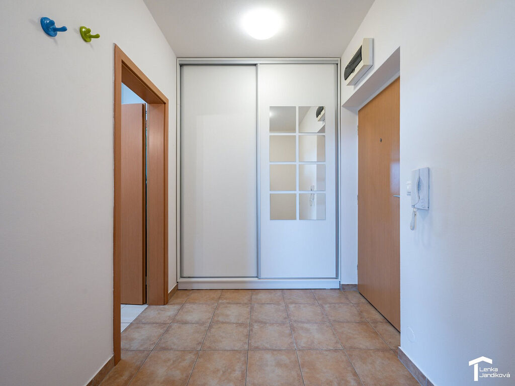 Po vstupu do bytu se ocitáme v prostorné chodbě, kde je k dispozici vestavěná šatní skříň. Z chodby vejdeme do koupelny. Ta je spojená s WC a je osazena sprchovým koutem. Z chodby vstoupíme do světlého prostorného obývacího pokoje, na který navazuje kuchyňský kout. Kuchyňská linka má vestavěnou elektrickou varnou desku, elektrickou troubu, vestavěnou lednici s mrazákem a mikrovlnnou troubu. Z obývacího pokoje je vstup do ložnice, ze které vejdeme na lodžií.