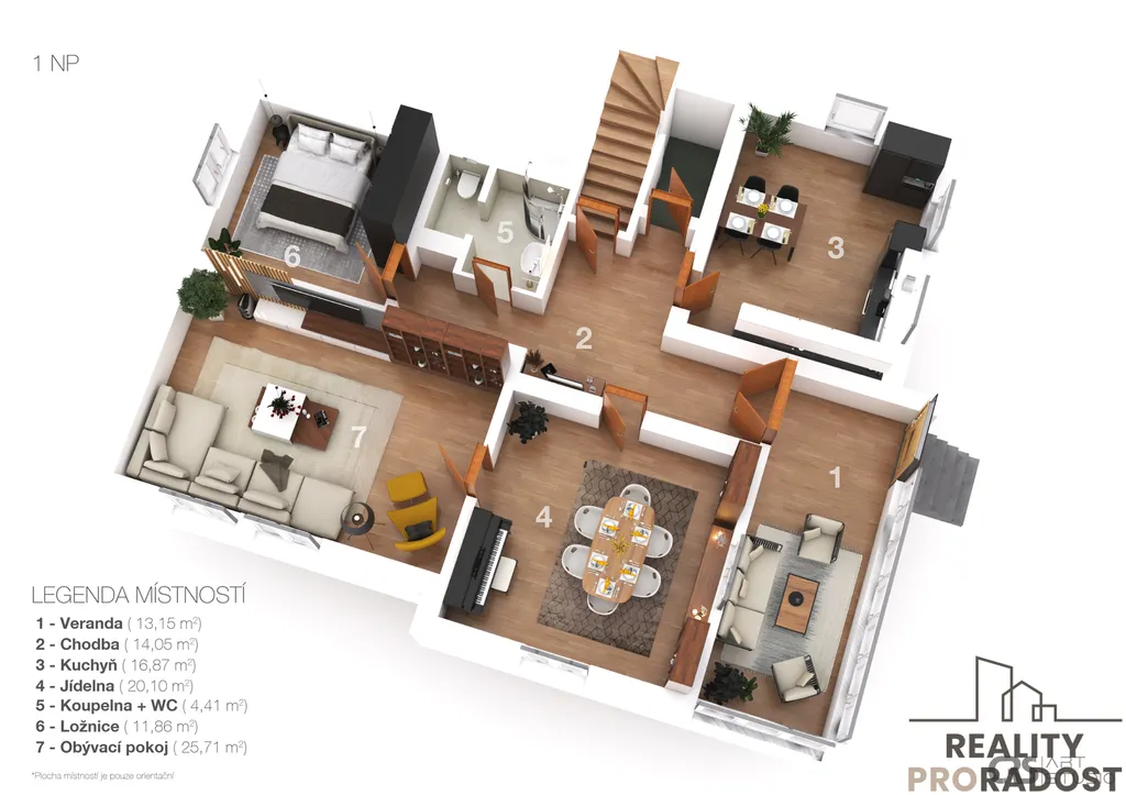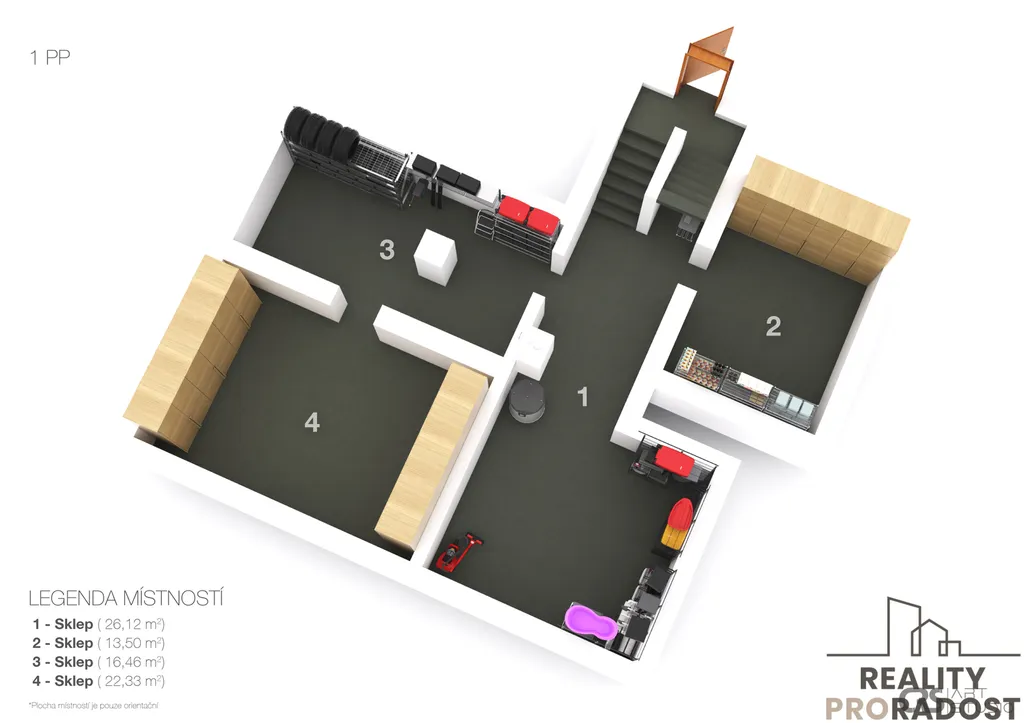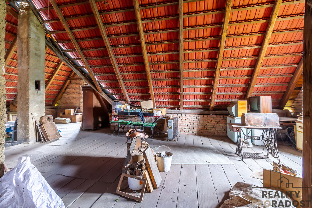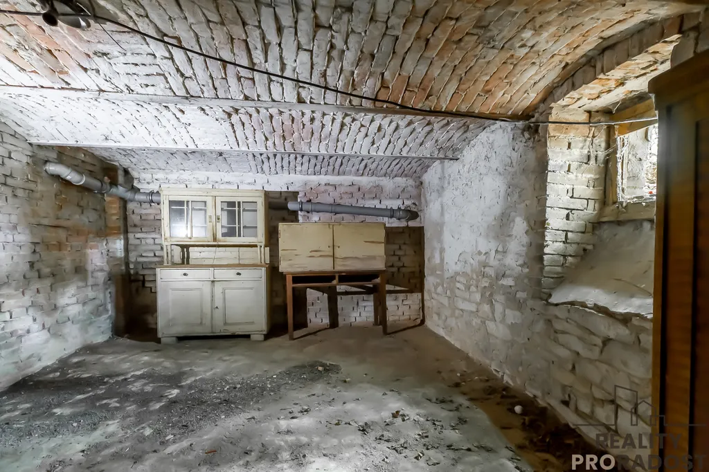 Dům disponuje sklepem ( 1PP ), ve kterém se nachází prostorné místnosti s krásnými klenbami. Ve zvýšeném přízemí ( 1NP ) se nachází veranda a vstupní chodba do obytné části domu, kde nalezneme kuchyň s jídelnou, obývací pokoj s průchodem do ložnice, samostatnou ložnici a koupelnu s wc. Z chodby vedou schody na prostornou půdu, která je vhodná k přestavbě a rozšíření celé dispozice domu. (viz. 3D plánek v galerii)