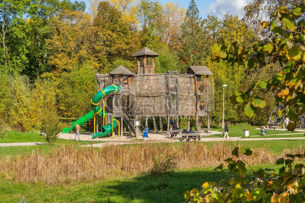 Park Zahrádky je doslova za rohem – krásné hřiště ve stylu mini „Mirakulum“, kavárna, jezírko.