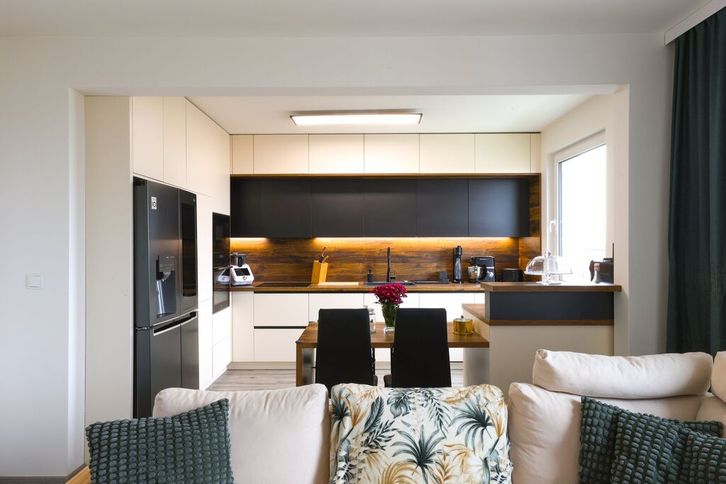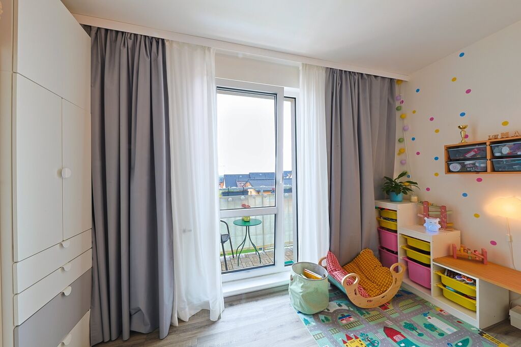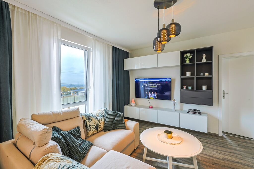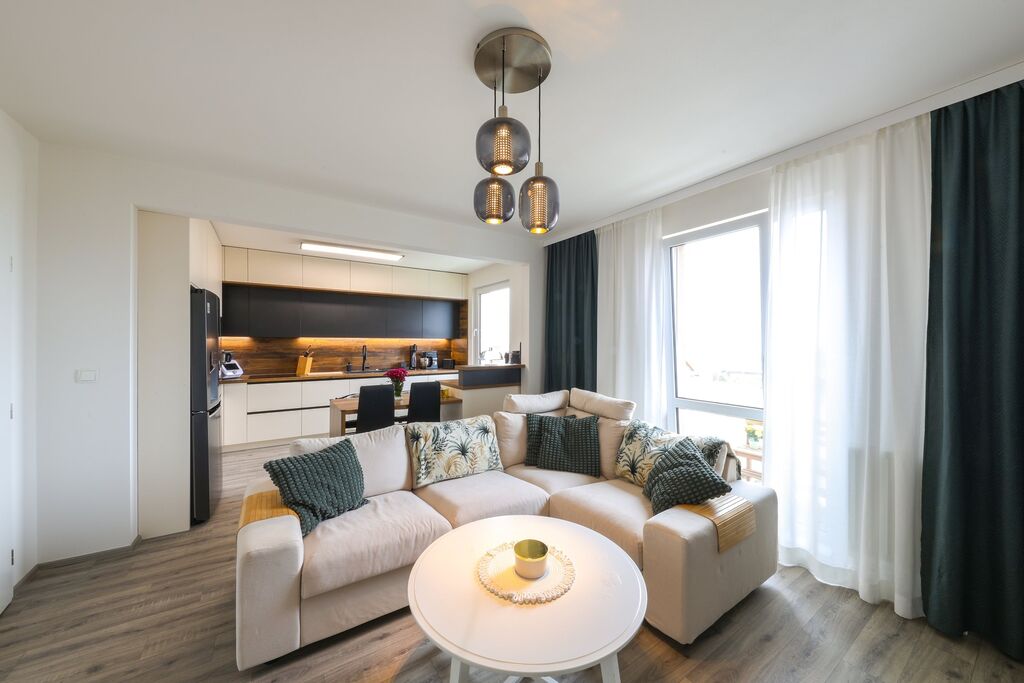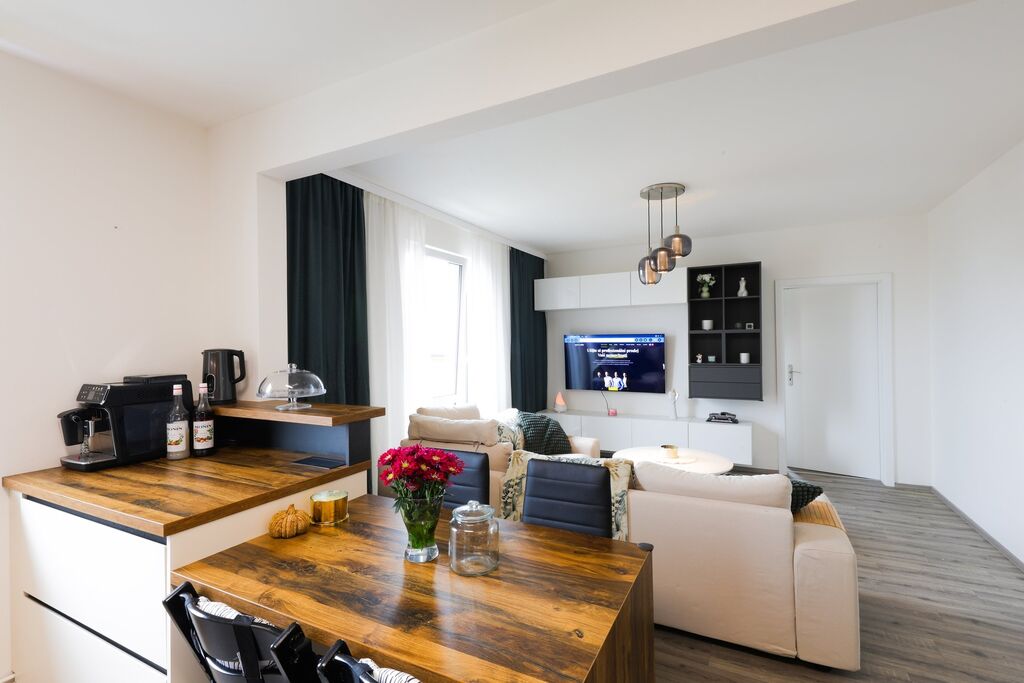 Dispozice bytu je velmi praktická - kromě velkého obývacího pokoje s decentně oddělenou kuchyní zde najdete 2 pokoje, oddělenou toaletu a také šatnu. Obývací pokoj i ložnice pak mají svůj vlastní balkon, který k bytu přidává dalších 3,41m2, které se nezapočítávají do užitné plochy, ale poskytují skvělou příležitost k relaxaci na čerstvém vzduchu.