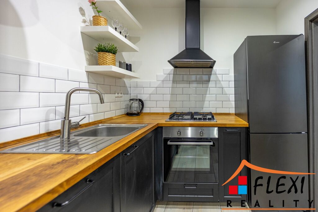 Součástí kuchyně je vkusná kuchyňská linka černé barvy s pracovní deskou v dekoru dřeva a vestavěnými spotřebiči, jako je myčka, horkovzdušná trouba, plynový sporák, mikrovlnná trouba, lednice s mrazákem a také pračka. A najdete zde i praktickou komodu s policemi a šuplíky.