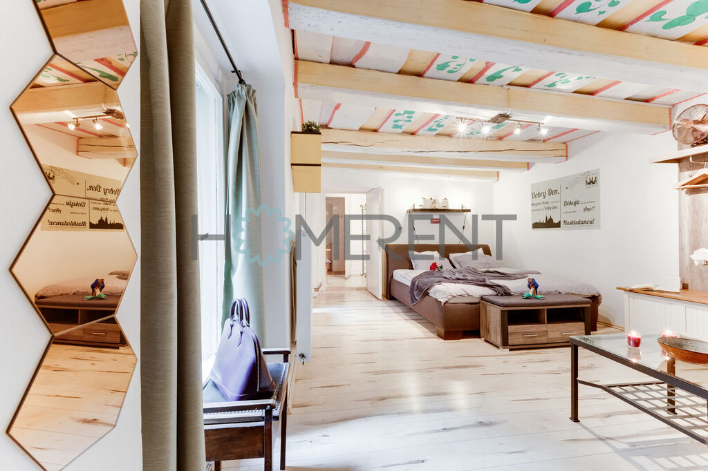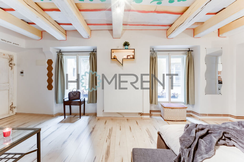 Byt tvoří samostatná ložnice a kuchyně s jídelním koutem, samozřejmostí je koupelna se sprchovým koutem. Interiér působí útulně a má nezaměnitelný charakter díky malovanému stropu, dřevěným trámům a rustikálním doplňkům, které bytu dodávají atmosféru staré Prahy. Stylové dřevěné dveře a původní detaily vytvářejí pocit domova s duší a historií.
