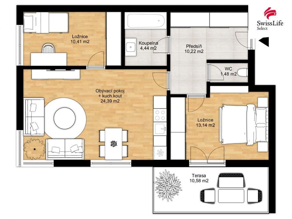 *Byt se skládá ze vstupní haly, obývacího prostoru s kuchyňským koutem, dvou samostatných pokojů a koupelny + WC.
