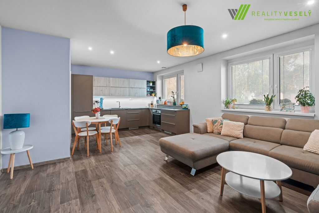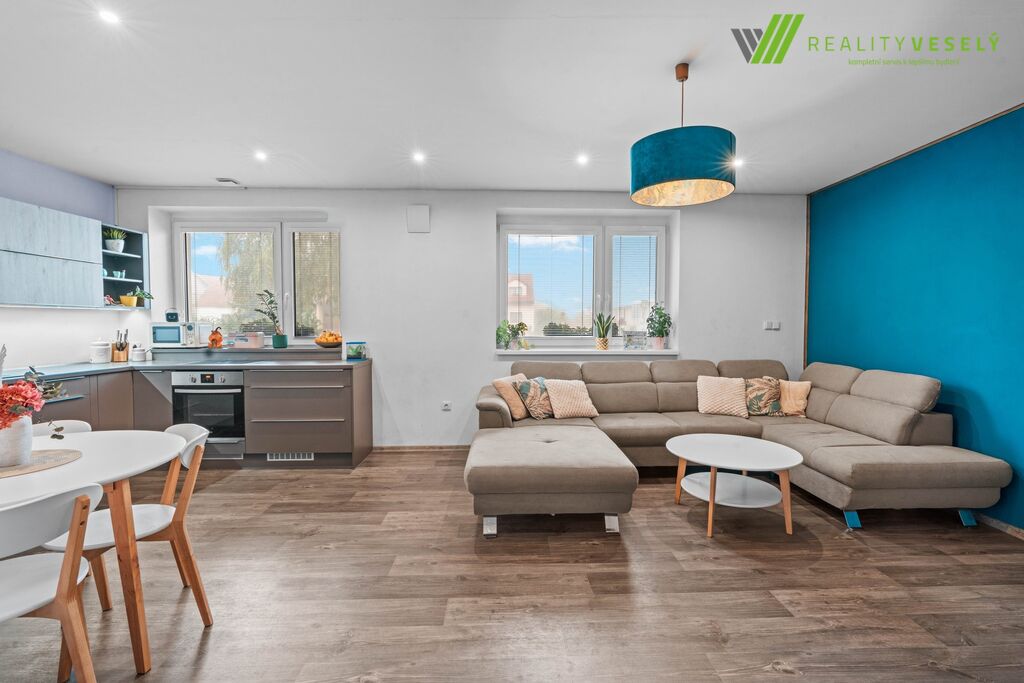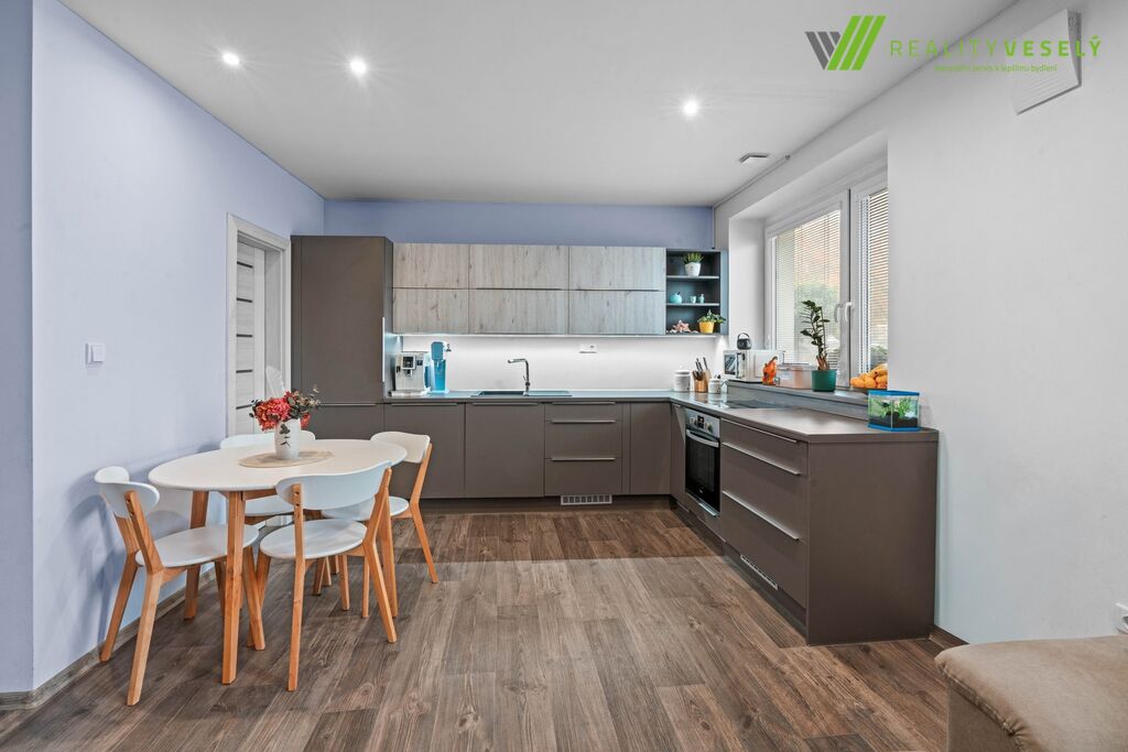 - světlý obývací pokoj s moderní kuchyňskou linkou a samostatnou spíží
